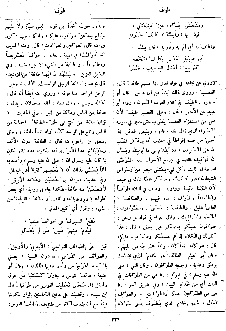 يُقَالُ: طَوَّفَ تَطْوِيفاً وتَطْوَافاً. والطَّائِفَةُ مِنَ الشَّيْءِ: جُزْءٌ مِنْهُ. وَفِي التَّنْزِيلِ الْعَزِيزِ: وَلْيَشْهَدْ عَذابَهُما طائِفَةٌ مِنَ الْمُؤْمِنِينَ