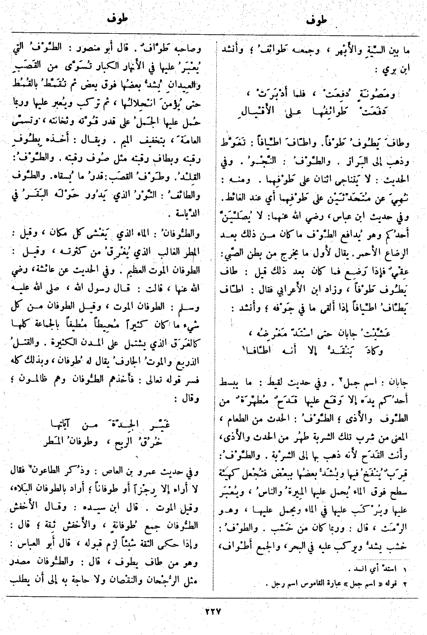 ؛ الطَّوْفُ: الْحَدَثُ مِنَ الطَّعَامِ، الْمَعْنَى مِنْ شُرْبِ تِلْكَ الشَّرْبَةِ طهُر مِنَ الْحَدَثِ والأَذى، وأَنث القَدَح لأَنه ذَهَبَ بِهَا إِلَى الشرْبة. والطَّوْفُ: قِرَبٌ يُنْفَخُ فِيهَا ويُشَدُّ بعضُها ببعْض فتُجْعل كَهَيْئَةِ سَطْحٍ فَوْقَ الْمَاءِ يُحمل عَلَيْهَا المِيرةُ والناسُ، ويُعْبَر عَلَيْهَا ويُرْكَب عَلَيْهَا فِي الْمَاءِ وَيُحْمَلُ عَلَيْهَا، وَهُوَ الرَّمَث، قَالَ: وَرُبَّمَا كَانَ مِنْ خَشب. والطَّوْفُ: خَشَبٌ يشدُّ وَيُرْكَبُ عَلَيْهِ فِي الْبَحْرِ، وَالْجَمْعُ أَطْوَاف، وَصَاحِبُهُ طَوَّافٌ. قَالَ أَبو مَنْصُورٍ: الطَّوْفُ الَّتِي يُعْبَرُ عَلَيْهَا فِي الأَنهار الْكِبَارِ تُسَوَّى مِنَ القَصَبِ والعِيدانِ يُشدُّ بعضُها فَوْقَ بَعْضٍ ثُمَّ تُقَمَّطُ بالقُمُط حَتَّى يُؤْمنَ انْحِلالُها، ثُمَّ تُرْكَبُ ويُعبر عَلَيْهَا وَرُبَّمَا حُمل عَلَيْهَا الجَملُ عَلَى قَدْرِ قُوَّته وَثَخَانَتِهِ، وتسمَّى العامَةَ، بِتَخْفِيفِ الْمِيمِ. وَيُقَالُ: أَخذه بِطُوفِ رَقَبَتِهِ وبطَافِ رَقَبَتِهِ مِثْلُ صُوف رَقَبَتِهِ. والطَّوْفُ: القِلْدُ. وطَوْفُ القصَب: قدرُ مَا يُسقاه. والطَّوف والطَّائِفُ: الثَّوْرُ الَّذِي يَدُور حَوْلَه البَقَرُ فِي الدِّياسة. والطُّوفَانُ: الْمَاءُ الَّذِي يَغْشى كُلَّ مَكَانٍ، وَقِيلَ: الْمَطَرُ الْغَالِبُ الَّذِي يُغْرِقُ مِنْ كَثْرَتِهِ، وَقِيلَ: الطُّوفَان الْمَوْتُ الْعَظِيمُ. وَفِي الْحَدِيثِ