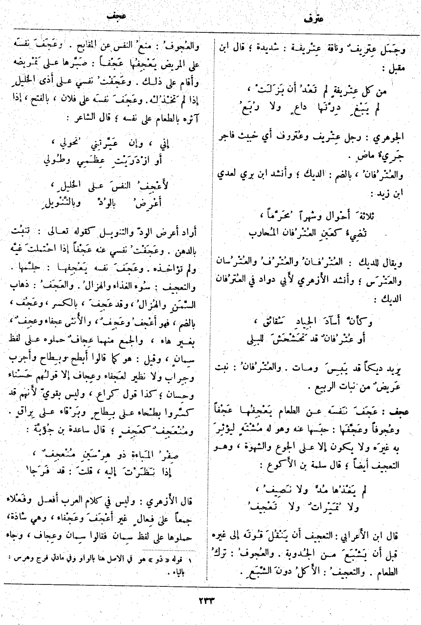 عجف: عَجَفَ نَفسَه عَنِ الطَّعَامِ يَعْجِفُها عَجْفاً وعُجُوفاً وعَجَّفَها: حبَسها عَنْهُ وَهُوَ لَهُ مُشْتَهٍ ليؤثِرَ بِهِ غيرَه وَلَا يَكُونُ إِلَّا عَلَى الْجُوعِ وَالشَّهْوَةِ، وَهُوَ التَّعْجِيف أَيْضًا؛ قَالَ سَلَمَةُ بْنُ الأَكوع: