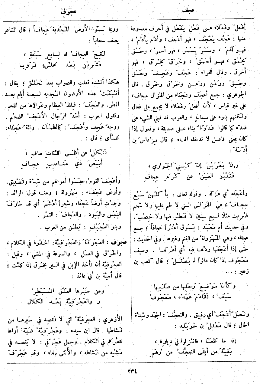 عجرف: العَجْرَفَةُ والعَجْرَفِيَّة: الجَفْوة فِي الْكَلَامِ، والخُرْق فِي العمَل، وَالسُّرْعَةُ فِي الْمَشْيِ، وَقِيلَ: العَجْرَفِيَّة أَن تأْخذ الإِبل فِي السَّيْرِ بخُرق إِذَا كلَّت؛ قَالَ أُميَّة بْنُ أَبي عَائِذٍ:
