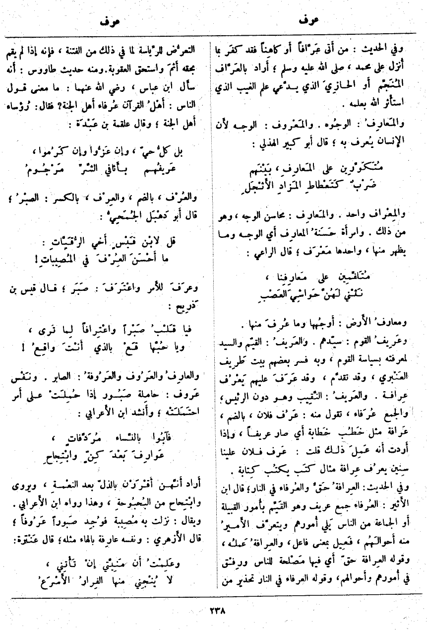؛ أَراد بالعَرَّاف المُنَجِّم أَو الحازِيَ الَّذِي يدَّعي عِلْمَ الْغَيْبِ الَّذِي استأْثر اللَّهُ بِعِلْمِهِ. والمَعارِفُ: الوجُوه. والمَعْرُوف: الْوَجْهُ لأَن الإِنسان يُعرف بِهِ؛ قَالَ أَبو كَبِيرٍ الْهُذَلِيُّ: