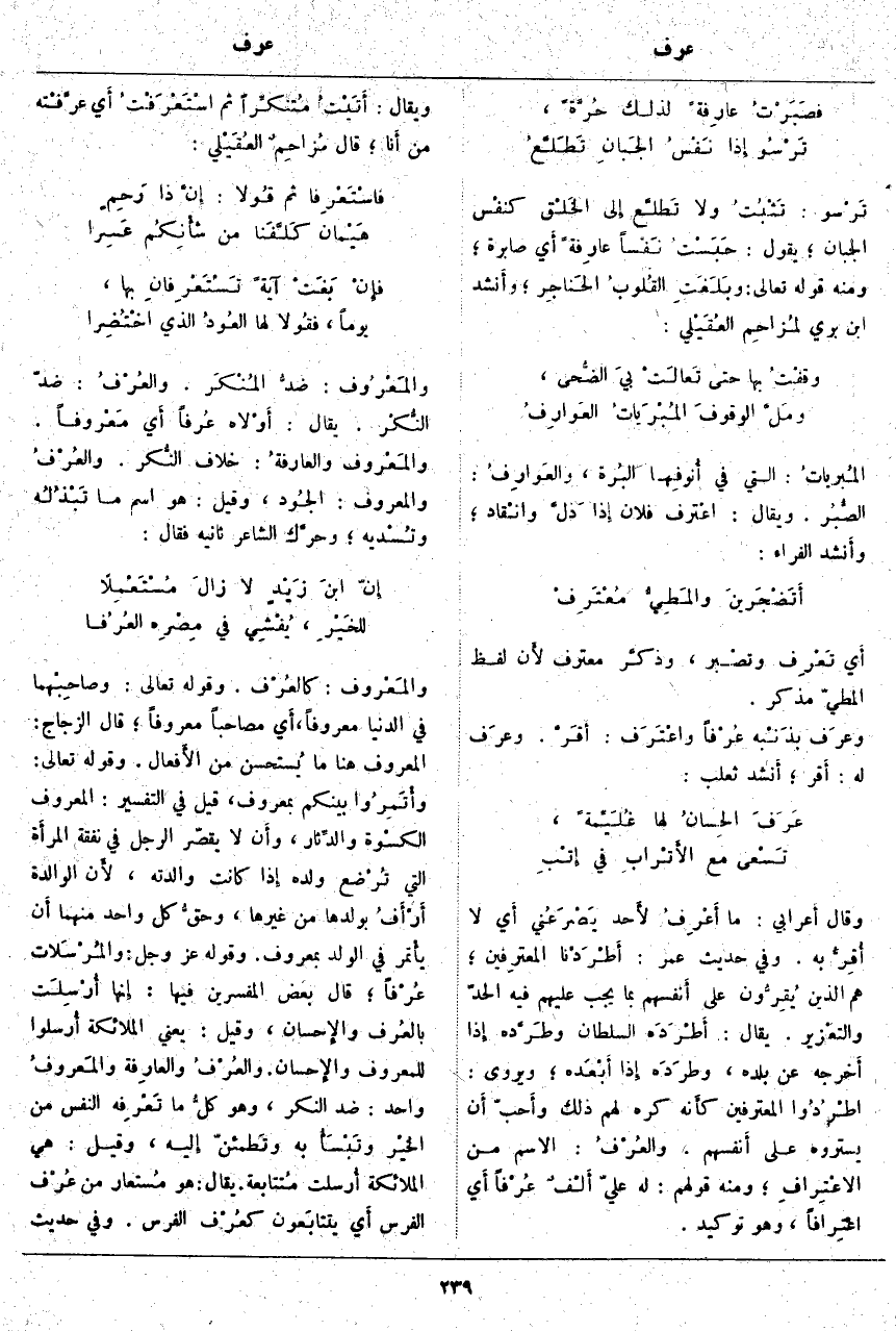 ؛ قَالَ بَعْضُ الْمُفَسِّرِينَ فِيهَا: إِنَّهَا أُرْسِلَت بالعُرف والإِحسان، وَقِيلَ: يَعْنِي الْمَلَائِكَةَ أُرسلوا لِلْمَعْرُوفِ والإِحسان. والعُرْفُ والعَارِفَة والمَعرُوفُ وَاحِدٌ: ضِدُّ النُّكْرِ، وَهُوَ كلُّ مَا تَعْرِفه النَّفْسُ مِنَ الخيْر وتَبْسَأُ بِهِ وتَطمئنّ إِلَيْهِ، وَقِيلَ: هِيَ الْمَلَائِكَةُ أُرسلت مُتتابعة. يُقَالُ: هُوَ مُستعار مِنْ عُرْف الْفَرَسِ أَي يتتابَعون كعُرْف الْفَرَسِ. وَفِي حَدِيثِ