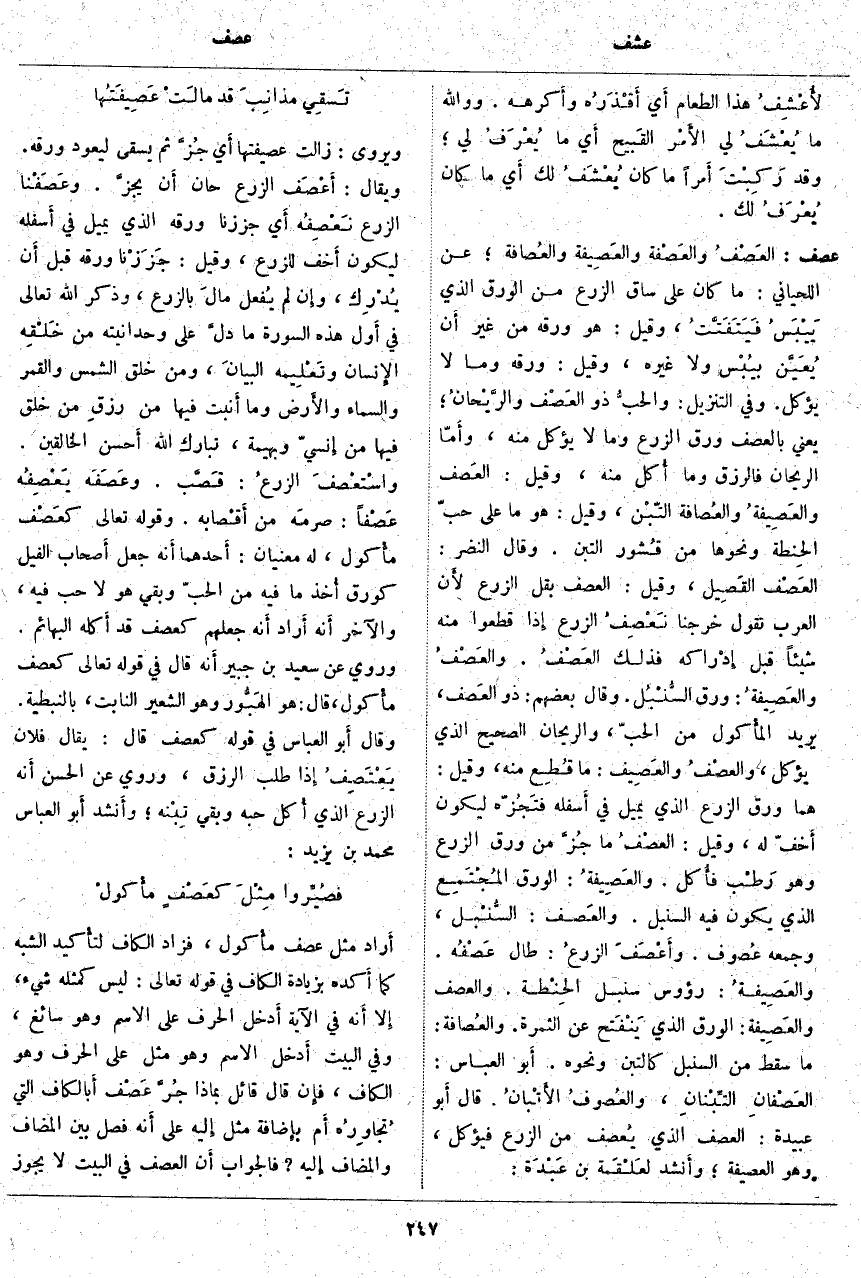 ، يُرِيدُ المأْكول مِنَ الْحَبِّ، والرَّيْحانُ الصَّحِيحُ الَّذِي يُؤْكَلُ، والعصْفُ والعَصِيف: مَا قُطِع مِنْهُ، وَقِيلَ: هُمَا وَرَقُ الزَّرْعِ الَّذِي يَمِيلُ فِي أَسفله فتَجُزّه لِيَكُونَ أَخفّ لَهُ، وَقِيلَ: العصْفُ مَا جُزَّ مِنْ وَرَقِ الزَّرْعِ وَهُوَ رَطْب فأُكل. والعَصِيفَةُ: الْوَرَقُ المُجْتَمِع الَّذِي يَكُونُ فِيهِ السُّنْبُلُ. والعَصف: السُّنْبل، وَجَمْعُهُ عُصُوف. وأَعْصَفَ الزرعُ: طَالَ عَصْفُه. والعَصِيفةُ: رؤوس سُنْبُلِ الحِنْطة. وَالْعَصْفُ والعَصِيفة: الْوَرَقُ الَّذِي يَنْفَتح عَنِ الثَّمَرَةِ والعُصَافة: مَا سَقَطَ مِنَ السُّنْبُلِ كَالتِّبْنِ وَنَحْوِهِ. أَبو الْعَبَّاسِ: العَصْفانِ التِّبْنانِ، والعُصُوفُ الأَتْبانُ. قَالَ أَبو عُبَيْدَةَ: الْعَصْفُ الَّذِي يُعصف مِنَ الزَّرْعِ فَيُؤْكَلُ، وَهُوَ العَصِيفَة؛ وأَنشد لعَلْقَمة بْنِ عَبْدَة:
