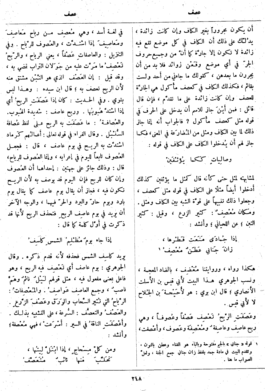 ، قَالَ: فَجَعَلَ العُصوف تَابِعًا لِلْيَوْمِ فِي إِعْرَابِهِ، وَإِنَّمَا العُصُوف لِلرِّيَاحِ، قَالَ: وَذَلِكَ جَائِزٌ عَلَى جِهَتَيْنِ: إِحْدَاهُمَا أَن العُصُوف وَإِنْ كَانَ لِلرِّيحِ فَإِنَّ الْيَوْمَ قَدْ يُوصَفُ بِهِ لأَن الرِّيحَ تَكُونُ فِيهِ، فَجَازَ أَن يُقَالَ يَوْمٌ عَاصِفٌ كَمَا يُقَالُ يَوْمٌ بَارِدٌ وَيَوْمٌ حَارٌّ وَالْبَرْدُ وَالْحَرُّ فِيهِمَا، وَالْوَجْهُ الْآخَرُ أَن يُرِيدَ فِي يَوْمٍ عَاصِف الريحِ فَتُحْذَفُ الرِّيحُ لأَنها قَدْ ذُكِرَتْ فِي أَوَّل كَلِمَةٍ كَمَا قَالَ: