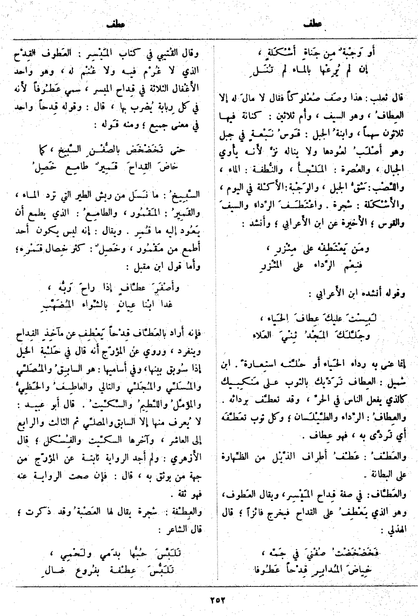 إِنَّمَا عَنَى بِهِ رِدَاءَ الحَياء أَو حُلَّته استِعارةً. ابْنُ شُمَيْلٍ: العِطَاف تَرَدِّيك بِالثَّوْبِ عَلَى مَنكِبيك كَالَّذِي يَفْعَلُ النَّاسُ فِي الحرِّ، وَقَدْ تَعَطَّفَ بِرِدَائِهِ. والعِطَافُ: الرِّداء والطَّيْلَسان؛ وَكُلُّ ثَوْبٍ تَعَطَّفَه أَي تَردَّى بِهِ، فَهُوَ عِطَاف. والعَطْفُ: عَطْفُ أَطراف الذَّيْل مِنَ الظِّهارة عَلَى الْبِطَانَةِ. والعَطَّاف: فِي صِفَةِ قِداح المَيْسِر، وَيُقَالُ العَطُوف، وَهُوَ الَّذِي يَعْطِفُ عَلَى الْقِدَاحِ فَيَخْرُجُ فَائِزًا؛ قَالَ الْهُذَلِيُّ: