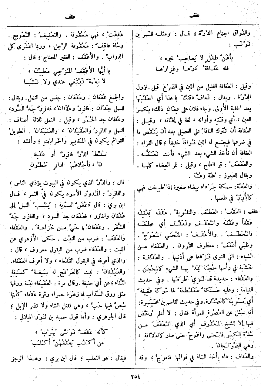 عقف: العَقْفُ: العَطْف والتلْوِيةُ. عَقَفَه يَعْقِفُه عَقْفاً وعَقَّفَه وانْعَقَف وتَعَقَّف أَي عطَفَه فانْعَطَفَ. والأَعْقَفُ: المنْحَني المُعْوَجّ. وظبْي أَعْقَفُ: مَعْطُوفُ القُرون. والعَقْفَاء مِنَ الشِّيَاهِ: الَّتِي الْتَوَى قرْناها عَلَى أُذنيها. والعُقَّافَة: خَشَبة فِي رأْسها حُجْنة يُمَدُّ بِهَا الشَّيْءُ كالمِحْجَن. والعَقْفَاء: حَدِيدَةٌ قَدْ لُوِيَ طَرَفُها. وَفِي حَدِيثِ القيامةِ: