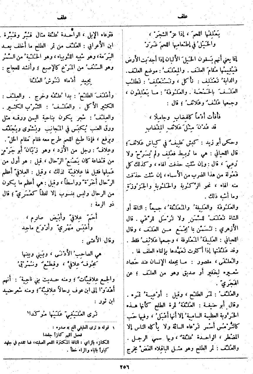 وَحَكَى أَبو زَيْدٍ: كَبْشٌ عَلِيفٌ فِي كِباش عَلائِفَ؛ قَالَ اللِّحْيَانِيُّ: هِيَ مَا رُبِط فعُلِف وَلَمْ يُسَرَّحْ وَلَا رُعِيَ، قَالَ: وَإِنْ شِئْتَ حَذَفْتَ الْهَاءَ، وَكَذَلِكَ كُلُّ فَعُولة مِنْ هَذَا الضَّرْبَ مِنَ الأَسماء، إِنْ شِئْتَ حذَفت مِنْهُ الْهَاءَ، نَحْوَ الرَّكُوبة والحَلُوبةِ والجَزُوزَةِ وَمَا أَشبه ذَلِكَ. والعَلُوفَة والعَلِيفةُ والمُعَلَّفَةُ، جَمِيعًا: النَّاقَةُ أَو الشَّاةُ تُعْلَفُ للسِّمَنِ وَلَا تُرْسَل للرَّعْي. قَالَ الأَزهري: تُسَمَّن بِمَا يُجْمَع مِنَ العَلَف، وَقَالَ اللِّحْيَانِيُّ: العَلِيفَةُ المَعْلوفة، وَجَمْعُهَا عَلائِفُ فَقَطْ. وَقَدْ عَلَّفْتُها إِذَا أَكثرت تَعَهُّدها بِإِلْقَاءِ الْعَلَفِ لَهَا. والعُلْفَى، مَقْصُورٌ: مَا يَجْعَلُهُ الإِنسان عِنْدَ حَصاد شَعِيرِهِ لِخَفير أَو صَدِيقٍ وَهُوَ مِنَ العلَف؛ عَنِ الهَجَريّ. والعُلَّفُ: ثمَر الطلْح، وَقِيلَ: أَوْعِيةُ ثمَره. وَقَالَ أَبو حَنِيفَةَ: العُلَّفَةُ ثَمَرَةُ الطَّلْحِ كأَنها هَذِهِ الخَرُّوبة الْعَظِيمَةُ السامِيةُ إِلَّا أَنها أَعْبَلُ، وَفِيهَا حَب كالتُّرْمُس أَسْمر تَرْعاه السَّائِمَةُ وَلَا يأْكله النَّاسُ إِلَّا المضْطر، الْوَاحِدَةُ عُلَّفةٌ، وَبِهَا سُمِّيَ الرَّجُلُ. والعُلَّف: ثَمَرُ الطَّلْحِ وَهُوَ مِثْلُ الباقِلاء الغَضِّ يَخْرُجُ فَتَرْعَاهُ الإِبل، الْوَاحِدَةُ عُلَّفة مِثَالُ قُبَّر وقُبَّرة. ابْنُ الأَعرابي: العُلَّف مِنْ ثَمَرِ الطَّلْحِ مَا أخَلف بَعْدَ البَرَمة، وَهُوَ شَبِيهُ اللُّوبياء، وَهُوَ الحُلْبةُ مِنَ السَّمُر وَهُوَ السّنْفُ مِنَ المَرْخ كالإِصبع؛ وأَنشد لِلْعَجَّاجِ: