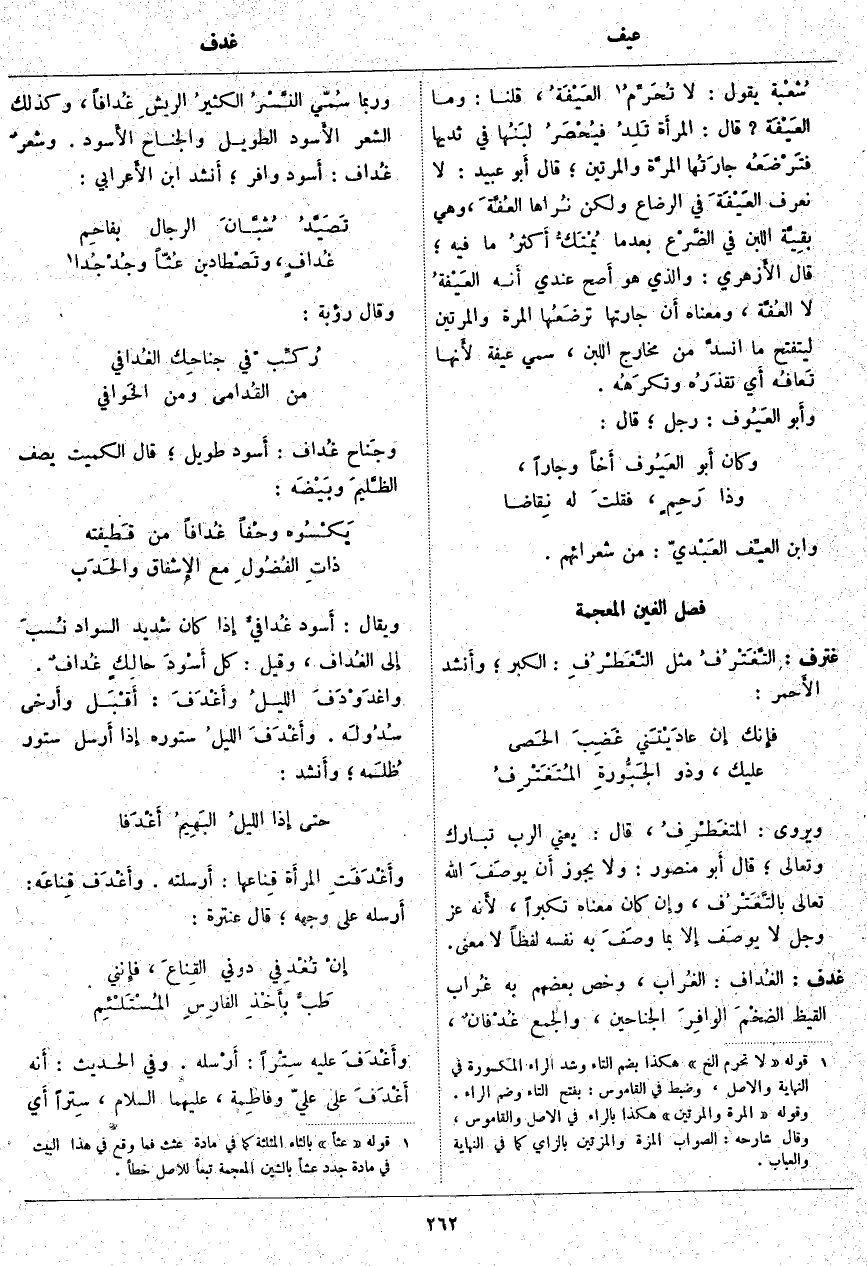 غدف: الغُداف: الغُراب، وَخَصَّ بَعْضُهُمْ بِهِ غُراب الْقَيْظِ الضخْمَ الوافِرَ الْجَنَاحَيْنِ، وَالْجَمْعُ غُدْفانٌ، وَرُبَّمَا سُمّي النَّسْرُ الكثيرُ الريشِ غُدَافاً، وَكَذَلِكَ الشَّعْرُ الأَسود الطَّوِيلُ وَالْجَنَاحُ الأَسود. وشعرٌ غُدَاف: أَسود وَافِرٌ؛ أَنشد ابْنُ الأَعرابي:
