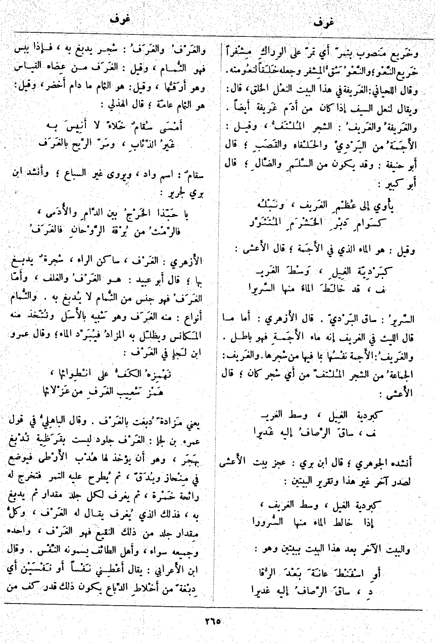 الأَزهري: الغَرْف، سَاكِنُ الرَّاءِ، شجرةٌ يُدْبَغُ بِهَا؛ قَالَ أَبو عُبَيْدٍ: هُوَ الغَرْفُ وَالْغُلْفُ، وأَمّا الغَرَفُ فَهُوَ جِنْسٌ مِنَ الثُّمام لَا يُدبغ بِهِ. والثُّمام أَنواع: مِنْهُ الغَرَف وَهُوَ شَبيه بالأَسَل وتُتّخذ مِنْهُ المَكانس وَيُظَلَّلُ بِهِ المزادُ فيُبَرِّد الْمَاءَ؛ وَقَالَ عَمْرُو بْنُ لَجإٍ فِي الغَرْف: