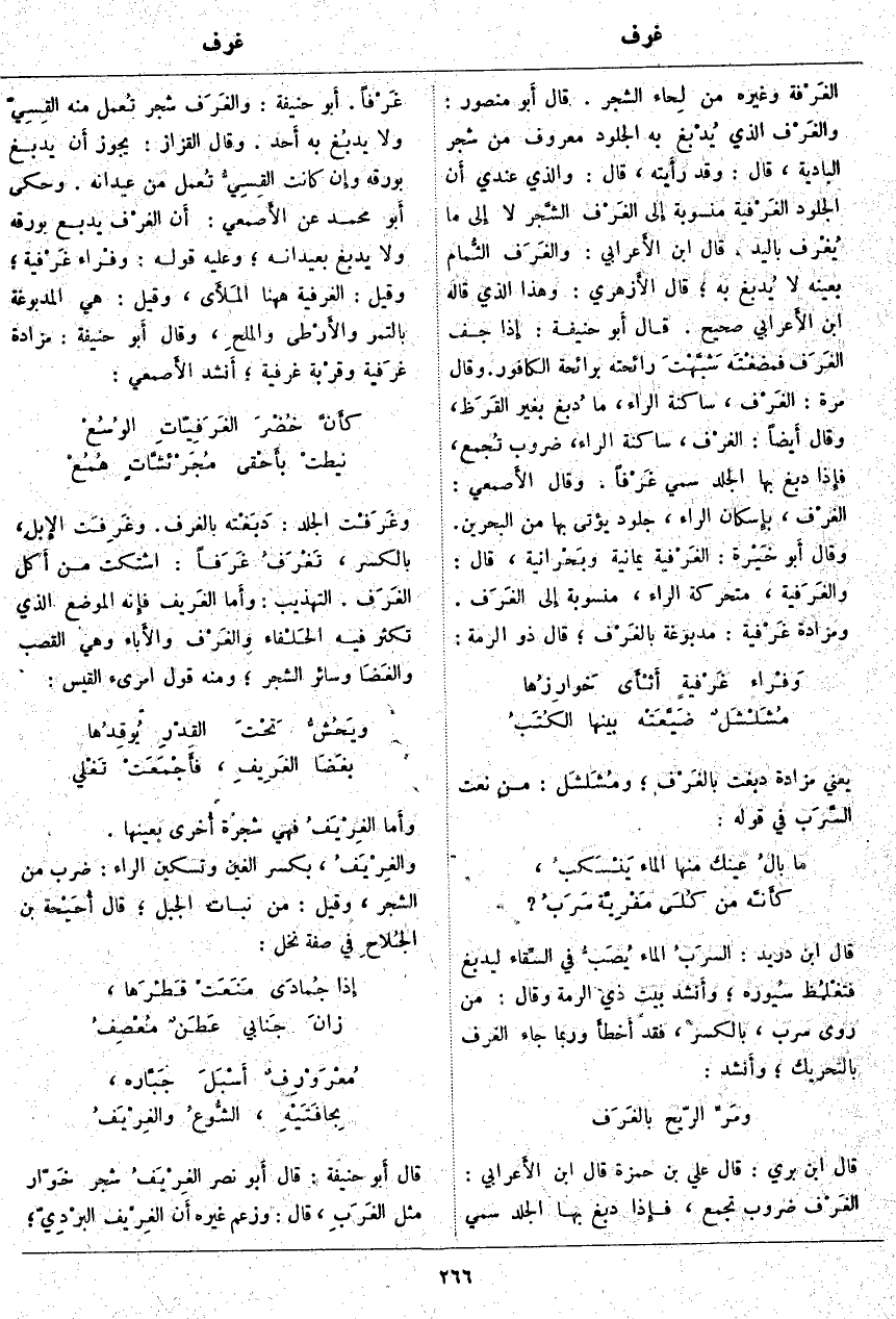 قَالَ ابْنُ بَرِّيٍّ: قَالَ عَلِيُّ بْنُ حَمْزَة قَالَ ابْنُ الأَعرابي: الغَرْف ضُرُوبٌ تُجْمَعُ، فَإِذَا دُبِغَ بِهَا الْجِلْدُ سُمِّيَ غَرْفاً. أَبو حَنِيفَةَ: والغَرَف شَجَرٌ تُعمل مِنْهُ القِسِيّ وَلَا يدبُغ بِهِ أَحد. وَقَالَ الْقَزَّازُ: يَجُوزُ أَن يُدْبَغَ بِوَرَقِهِ وَإِنْ كَانَتِ القِسِيُّ تُعمل مِنْ عِيدَانِهِ. وَحَكَى أَبو مُحَمَّدٍ عَنِ الأَصمعي: أَن الغَرْف يُدْبَغُ بِوَرَقِهِ وَلَا يُدْبَغُ بِعِيدَانِهِ؛ وَعَلَيْهِ قَوْلُهُ: وفْراء غَرْفِيَّة؛ وَقِيلَ: الغَرْفِيَّة هَاهُنَا المَلأَى، وَقِيلَ: هِيَ الْمَدْبُوغَةُ بِالتَّمْرِ والأَرْطى والملحِ، وَقَالَ أَبو حَنِيفَةَ: مَزَادَةٌ غَرَفِيَّة وقرْبة غَرَفِيَّة؛ أَنشد الأَصمعي: