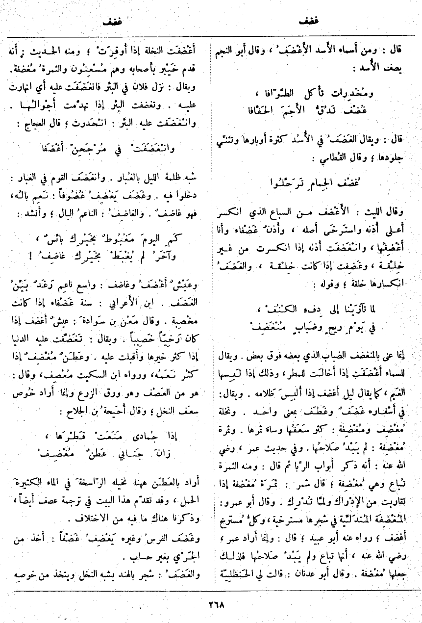 أَراد بالعَطَن هَاهُنَا نَخِيلَهُ الرّاسخةَ فِي الْمَاءِ الكثيرةَ الْحَمْلِ، وَقَدْ تَقَدَّمَ هَذَا الْبَيْتِ فِي تَرْجَمَةِ عصف أَيضاً، وَذَكَرْنَا هُنَاكَ مَا فِيهِ مِنَ الِاخْتِلَافِ. وغَضَف الفرسُ وَغَيْرُهُ يَغْضِفُ غَضْفاً: أَخذ مِنَ الجَرْي بِغَيْرِ حِسَابٍ. والغَضَفُ: شَجَرٌ بِالْهِنْدِ يُشْبِهُ النَّخْلَ وَيُتَّخَذُ مِنْ خوصِه