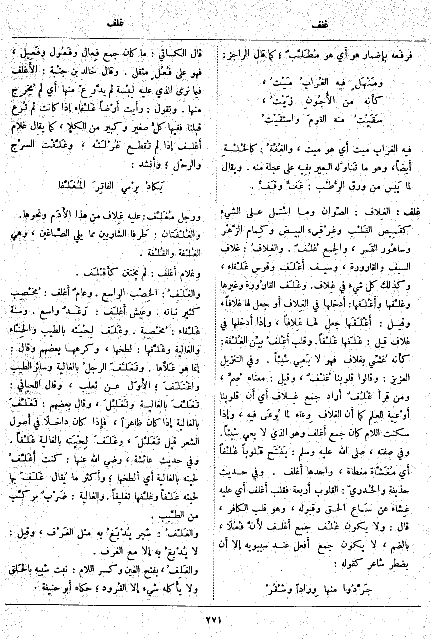 غلف: الغِلاف: الصِّوان وَمَا اشْتَمَلَ عَلَى الشَّيْءِ كقَمِيص القَلْب وغِرْقِئِ الْبَيْضِ وكِمام الزَّهْر وساهُور القَمر، وَالْجَمْعُ غُلُفٌ. والغِلافُ: غِلَافُ السَّيْفِ وَالْقَارُورَةِ، وَسَيْفٌ أَغْلَف وَقَوْسٌ غَلْفَاء، وَكَذَلِكَ كُلُّ شَيْءٍ فِي غِلاف: وغَلَف القارُورة وَغَيْرَهَا وغَلَّفَها وأَغْلَفَها: أَدخلها فِي الغِلاف أَو جَعَلَ لَهَا غِلَافًا، وَقِيلَ: أَغْلَفَها جَعَلَ لَهَا غِلافاً، وَإِذَا أَدخلها فِي غِلَافٍ قِيلَ: غَلَفها غَلْفاً. وَقَلْبٌ أَغْلَفُ بيِّن الغُلْفة: كأَنه غُشِّي بِغِلَافٍ فَهُوَ لَا يَعِي شَيْئًا. وَفِي التَّنْزِيلِ الْعَزِيزِ: وَقالُوا قُلُوبُنا غُلْفٌ