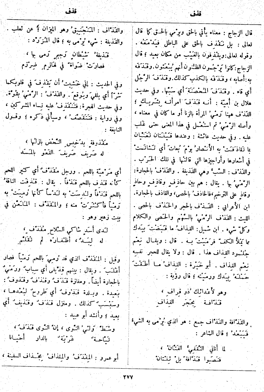 أَي تَشاتَمتْ فِي أَشعارها وأَراجيزها الَّتِي قالتْها فِي تِلْكَ الحَرْب. والقَذْف: السَّبُّ وَهِيَ القَذيفة. والقَذْفُ بِالْحِجَارَةِ: الرَّمْيُ بِهَا. يُقَالُ: هُمْ بَيْنَ حاذِفٍ وقاذِفٍ وحاذٍ وقاذٍ عَلَى التَّرْخِيمِ، فالحاذفُ بِالْحَصَى، وَالْقَاذِفُ بِالْحِجَارَةِ. ابْنُ الأَعرابي: القَذْف بِالْحَجَرِ والحَذْف بِالْحَصَى. اللَّيْثُ: القذْف الرَّمْيُ بالسَّهْم والحَصى وَالْكَلَامِ وَكُلِّ شَيْءٍ. ابْنُ شُمَيْلٍ: القِذافُ مَا قَبَضْتَ بيَدك مِمَّا يَمْلأُ الْكَفَّ فرَمَيْتَ بِهِ. قَالَ: وَيُقَالُ نِعْم جُلْمود القِذاف هَذَا. قَالَ: وَلَا يُقَالُ لِلْحَجَرِ نفسِه نِعْم القِذاف. أَبو خَيْرة: القِذافُ مَا أَطَقْتَ حَمْلَهُ بِيَدك ورمَيْته؛ قَالَ رُؤْبَةُ: