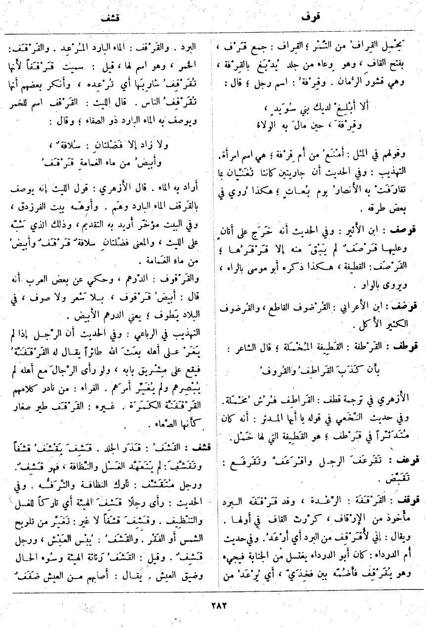 قرقف: القَرْقَفَة: الرِّعْدة، وَقَدْ قَرْقَفَه الْبَرْدُ مأْخوذ مِنَ الإِرْقاف، كرِّرت الْقَافُ فِي أَولها. وَيُقَالُ: إِنِّي لأُقَرْقِف مِنَ الْبَرْدِ أَي أُرْعَدُ. وَفِي حَدِيثِ
