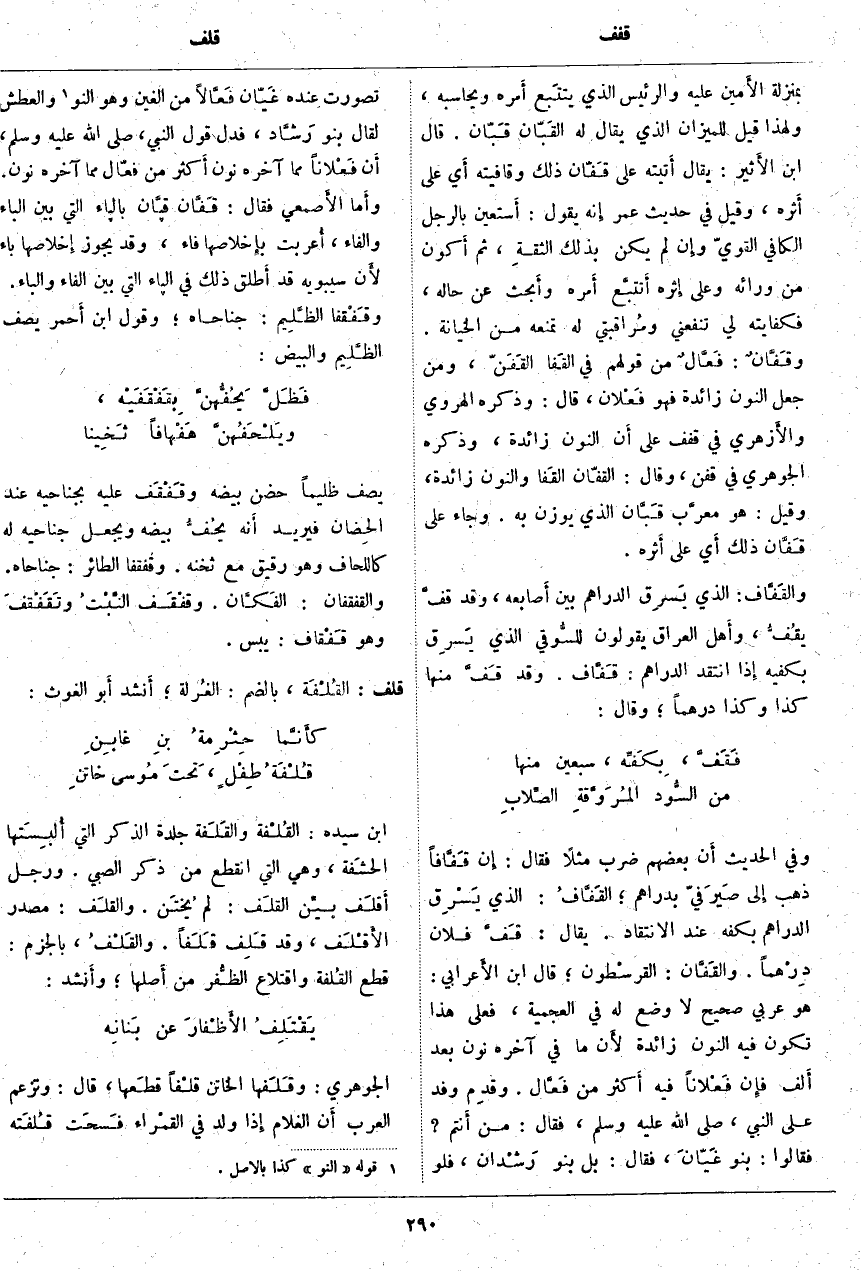 ، فَلَوْ تَصَوَّرَتْ عِنْدَهُ غَيّان فَعَّالًا مِنَ الْغَيْنِ وَهُوَ النُّو «1» وَالْعَطَشُ لَقَالَ بَنُو رَشَّاد، فَدَلَّ قَوْلُ النَّبِيِّ، صَلَّى اللَّهُ عَلَيْهِ وَسَلَّمَ، أَن فَعْلاناً مِمَّا آخِرُهُ نُونٌ أَكثر مِنْ فَعَّالٍ مِمَّا آخِرُهُ نُونٌ. وأَما الأَصمعي فَقَالَ: قَفَّان قپَّان بالپاء الَّتِي بَيْنَ الْبَاءِ وَالْفَاءِ، أُعربت بِإِخْلَاصِهَا فَاءً، وَقَدْ يَجُوزُ إِخْلَاصُهَا بَاءً لأَن سِيبَوَيْهِ قَدْ أَطلق ذَلِكَ في الپاء الَّتِي بَيْنَ الْفَاءِ وَالْبَاءِ. وقَفْقَفَا الظَّلِيم: جَنَاحَاهُ؛ وَقَوْلُ ابْنُ أَحمر يَصِفُ الظَّلِيم وَالْبَيْضَ: