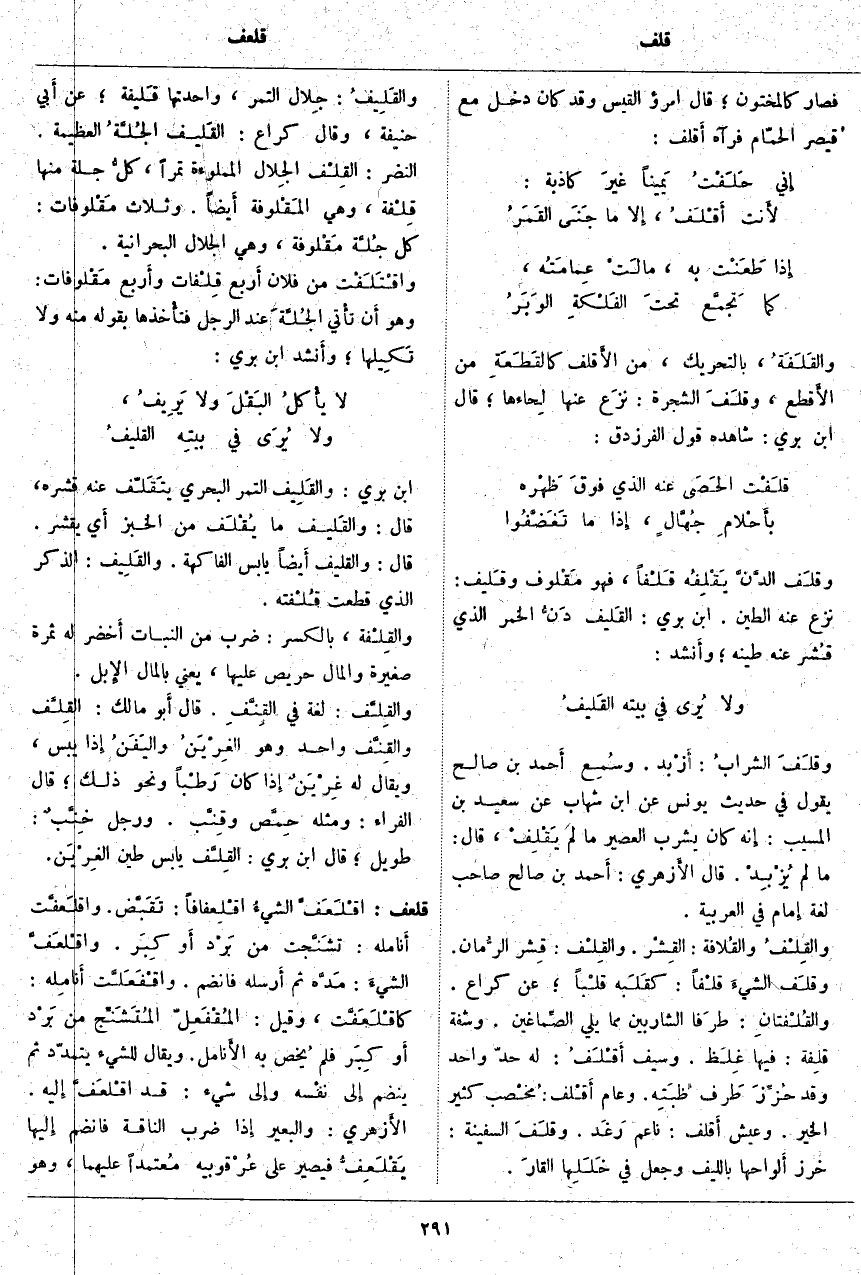 قَالَ الأَزهري: أَحمد بْنُ صَالِحٍ صَاحِبُ لُغَةٍ إِمَامٌ فِي الْعَرَبِيَّةِ. والقِلْفُ والقُلافَة: القِشْر. والقِلْف: قِشر الرُّمان. وقَلَفَ الشيءَ قَلْفاً: كقَلَبه قلْباً؛ عَنْ كُرَاعٍ. والقُلْفَتَانِ: طرَفا الشَّارِبَيْنِ مِمَّا يَلِي الصِّماغين. وَشَفَةٌ قَلِفَة: فِيهَا غِلَظ. وَسَيْفٌ أَقْلَفُ: لَهُ حَدٌّ وَاحِدٌ وَقَدْ حُزِّزَ طَرف ظُبَتِه. وَعَامٌ أَقْلَف: مُخْصب كَثِيرُ الْخَيْرِ. وَعَيْشٌ أَقْلَف: نَاعِمٌ رَغَد. وقَلَفَ السَّفِينَةَ: خَرَزَ أَلواحها بِاللِّيفِ وَجَعَلَ فِي خَلَلِها القارَ. والقَلِيفُ: جِلال التَّمْرِ، وَاحِدَتُهَا قَلِيفَة؛ عَنْ أَبي حَنِيفَةَ، وَقَالَ كُرَاعٌ: القَلِيف الجُلَّةُ الْعَظِيمَةُ. النَّضْرُ: القِلْف الجِلال الْمَمْلُوءَةُ تَمْرًا، كلُّ جُلَّةٍ مِنْهَا قِلْفَة، وَهِيَ المَقْلُوفَة أَيضاً. وَثَلَاثُ مَقْلُوفَات: كُلُّ جُلَّة مَقْلُوفَة، وَهِيَ الْجِلَالُ الْبَحْرَانِيَّةُ. واقْتَلَفْت مِنْ فُلَانٍ أَربع قِلْفَات وأَربع مَقْلُوفَات: وَهُوَ أَن تأْتي الجُلَّةَ عِنْدَ الرَّجُلِ فتأْخذها بقوله مِنْهُ وَلَا تَكِيلها؛ وأَنشد ابْنُ بَرِّيٍّ: