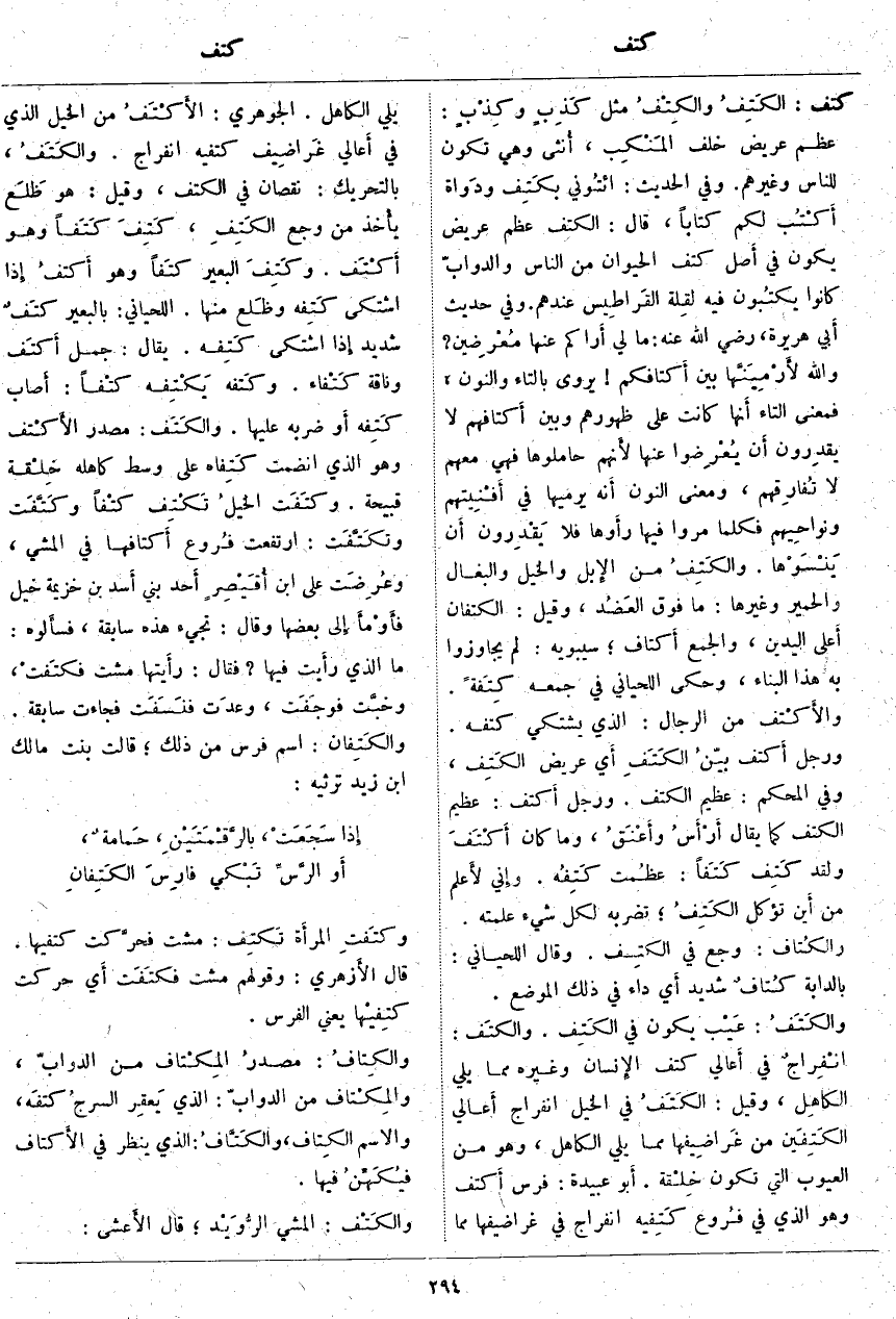كتف: الكَتِفُ والكِتْفُ مِثْلُ كَذِبٍ وكِذْبٍ: عَظْمٌ عَرِيضٌ خَلْفَ المَنْكِب، أُنثى وَهِيَ تَكُونُ لِلنَّاسِ وَغَيْرِهِمْ. وَفِي الْحَدِيثِ: