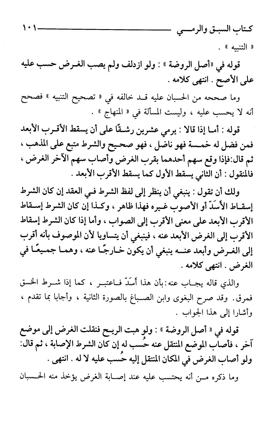 قوله: أما إذا قالا: يرمي عشرين رشقًا على أن يسقط الأقرب الأبعد فمن فضل له خمسة فهو ناضل، فهو صحيح والشرط متبع على المذهب، ثم قال: فإذا وقع سهم أحدهما بقرب الغرض وأصاب سهم الآخر الغرض، فالمنقول: أن الثاني يسقط الأول كما يسقط الأقرب الأبعد.