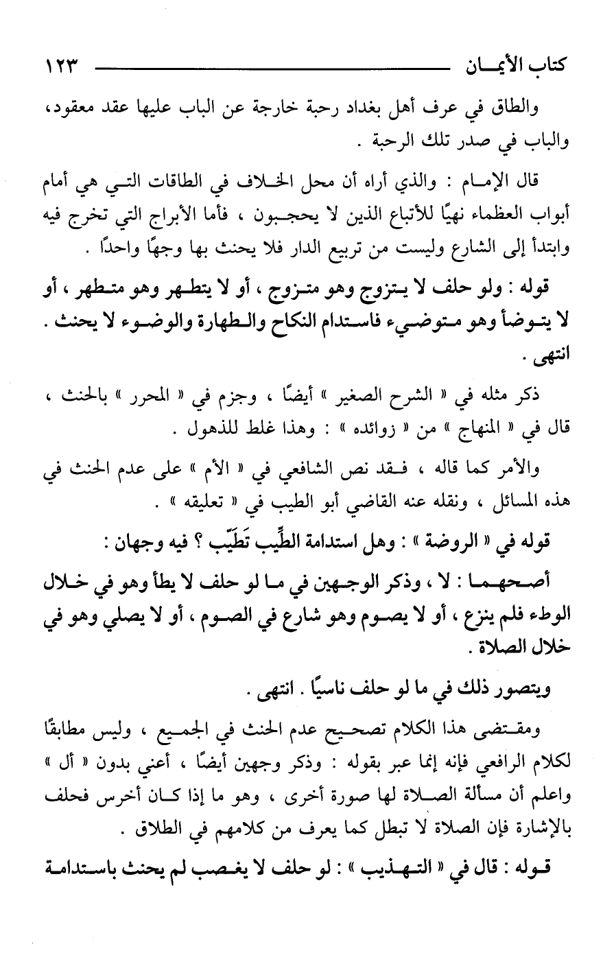 ومقتضى هذا الكلام تصحيح عدم الحنث في الجميع، وليس مطابقًا لكلام الرافعي فإنه إنما عبر بقوله: وذكر وجهين أيضًا، أعني بدون "أل" واعلم أن مسألة الصلاة لها صورة أخرى، وهو ما إذا كان أخرس فحلف بالإشارة فإن الصلاة لا تبطل كما يعرف من كلامهم في الطلاق.
