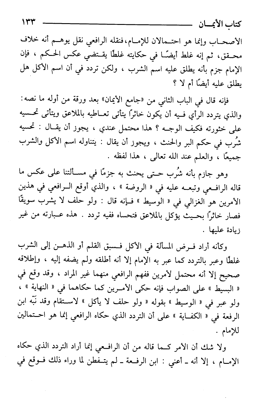 فإنه قال في الباب الثاني من "جامع الأيمان" بعد ورقة من أوله ما نصه: والذي يتردد الرأي فيه أن يكون خاثرًا يتأتى تعاطيه بالملاعق ويتأتى تحسيه على خثورته فكيف الوجه؟ هذا محتمل عندي، يجوز أن يقال: تحسيه شُرب في حكم البر والحنث، ويجوز أن يقال: يتناوله اسم الأكل والشرب جميعًا، والعلم عند الله تعالى، هذا لفظه.