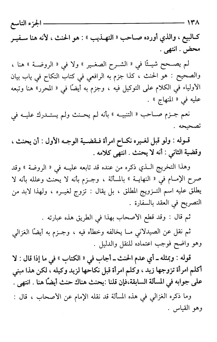 قوله: وبمثله -أي عدم الحنث- أجاب في "الكتاب" في ما إذا قال: لا أكلم امرأة تزوجها زيد، وكلم امرأة قبل نكاحها لزيد وكيله، لكن هذا مبني على جوابه في المسألة السابقة، فإن قلنا: يحنث هناك حنث أيضًا هنا. انتهى.