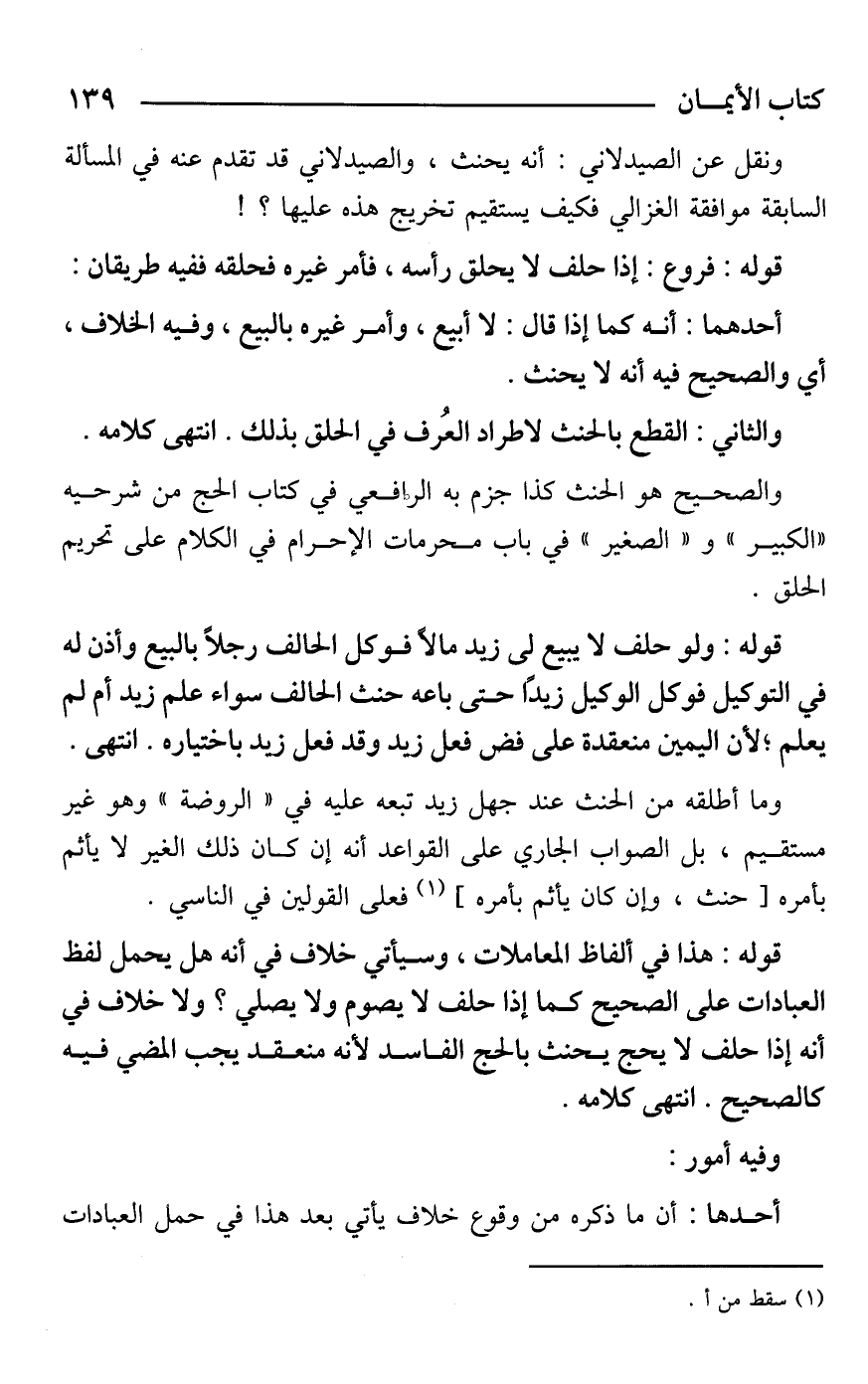 قوله: هذا في ألفاظ المعاملات، وسيأتي خلاف في أنه هل يحمل لفظ العبادات على الصحيح كما إذا حلف لا يصوم ولا يصلي؟ ولا خلاف في أنه إذا حلف لا يحج يحنث بالحج الفاسد لأنه منعقد يجب المضي فيه كالصحيح. انتهى كلامه.