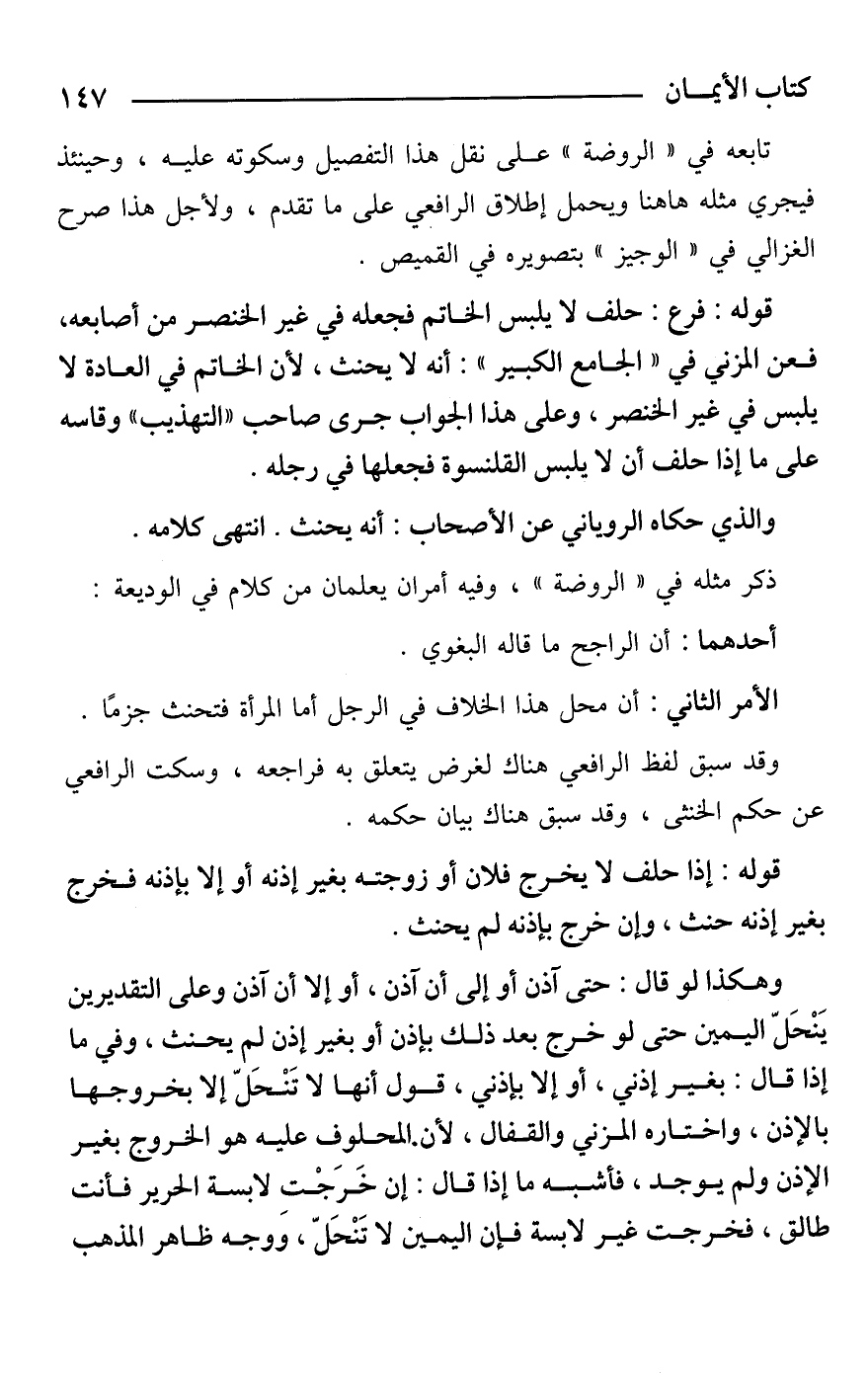 وهكذا لو قال: حتى آذن أو إلى أن آذن، أو إلا أن آذن وعلى التقديرين يَنْحَلّ اليمين حتى لو خرج بعد ذلك بإذن أو بغير إذن لم يحنث، وفي ما إذا قال: بغير إذني، أو إلا بإذني، قول أنها لا تَنحَل إلا بخروجها بالإذن، واختاره المزني والقفال، لأن المحلوف عليه هو الخروج بغير الإذن ولم يوجد، فأشبه ما إذا قال: إن خَرَجْت لابسة الحرير فأنت طالق، فخرجت غير لابسة فإن اليمين لا تَنْحَلّ، ووجه ظاهر المذهب