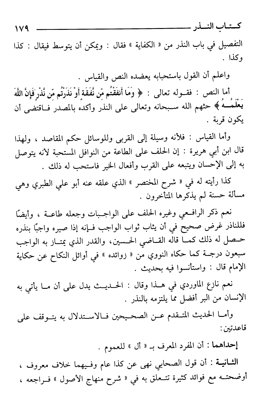 أما النص: فقوله تعالى: {وَمَا أَنْفَقْتُمْ مِنْ نَفَقَةٍ أَوْ نَذَرْتُمْ مِنْ نَذْرٍ فَإِنَّ اللَهَ يَعْلَمُهُ} حثهم الله سبحانه وتعالى على النذر وأكده بالمصدر فاقتضى أن يكون قربة.