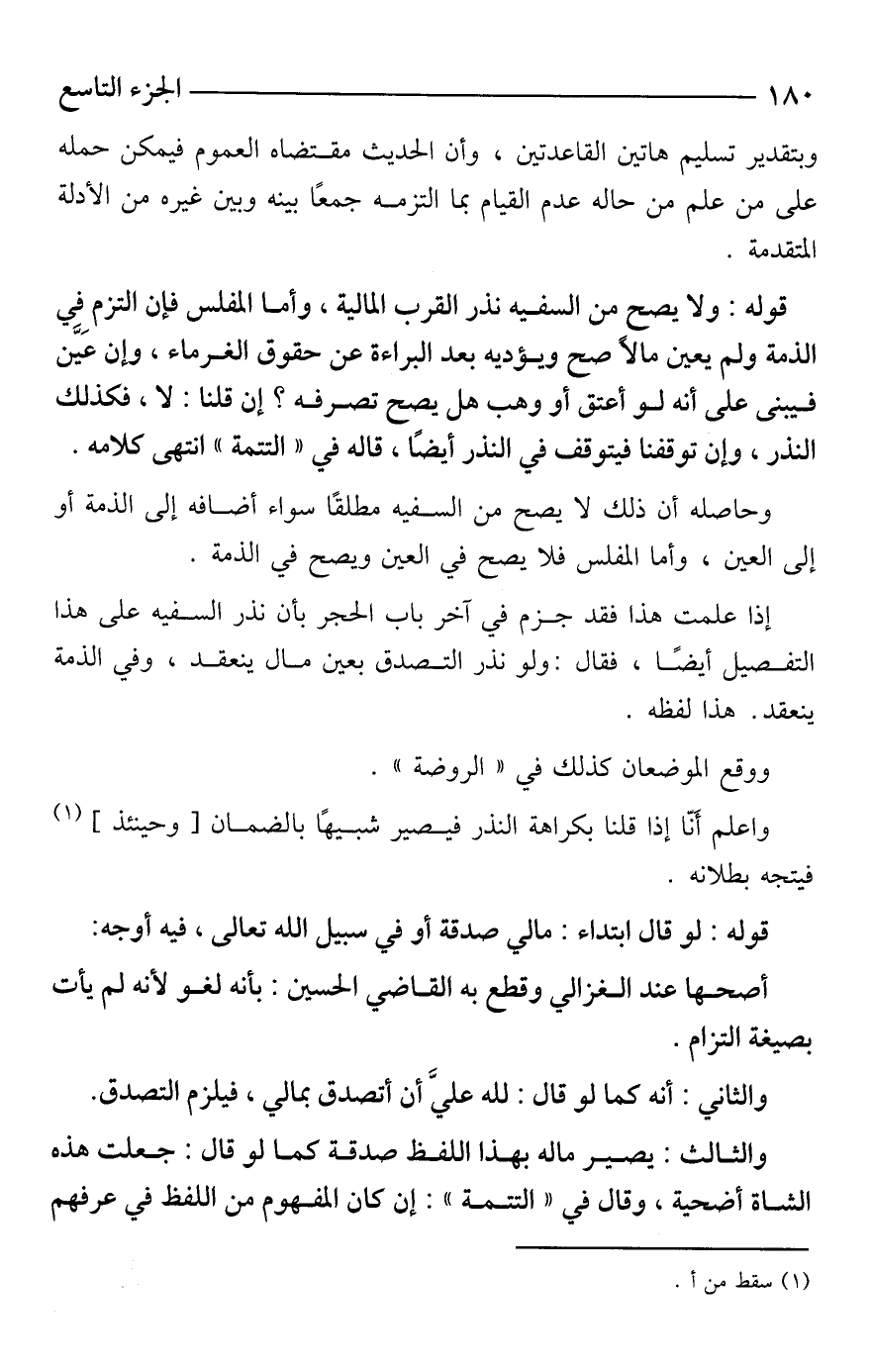 إذا علمت هذا فقد جزم في آخر باب الحجر بأن نذر السفيه على هذا التفصيل أيضًا، فقال: ولو نذر التصدق بعين مال ينعقد، وفي الذمة ينعقد. هذا لفظه.
