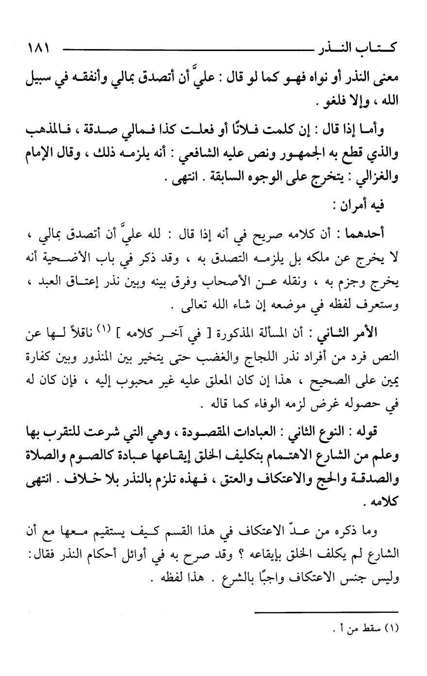 أحدهما: أن كلامه صريح في أنه إذا قال: لله عليَّ أن أتصدق بمالي، لا يخرج عن ملكه بل يلزمه التصدق به، وقد ذكر في باب الأضحية أنه يخرج وجزم به، ونقله عن الأصحاب وفرق بينه وبين نذر إعتاق العبد، وستعرف لفظه في موضعه إن شاء الله تعالى.