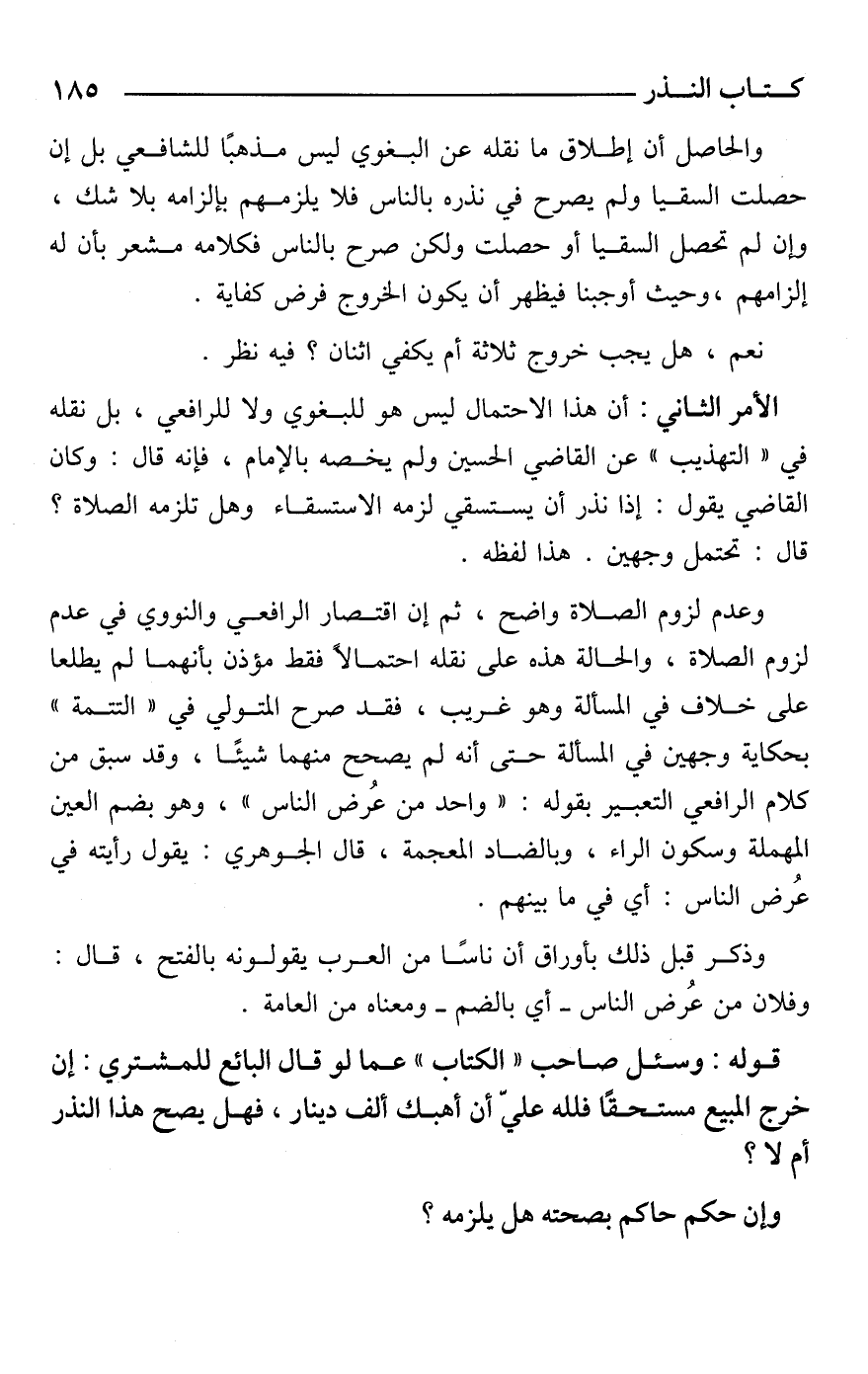 والحاصل أن إطلاق ما نقله عن البغوي ليس مذهبًا للشافعي بل إن حصلت السقيا ولم يصرح في نذره بالناس فلا يلزمهم بإلزامه بلا شك، وإن لم تحصل السقيا أو حصلت ولكن صرح بالناس فكلامه مشعر بأن له إلزامهم، وحيث أوجبنا فيظهر أن يكون الخروج فرض كفاية.