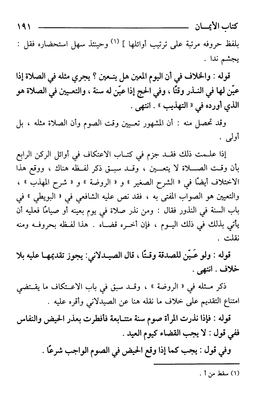 إذا علمت ذلك فقد جزم في كتاب الاعتكاف في أوائل الركن الرابع بأن وقت الصلاة لا يتعين، وقد سبق ذكر لفظه هناك، ووقع هذا الاختلاف أيضًا في "الشرح الصغير" و"الروضة" و"شرح المهذب"، والتعيين هو الصواب المفتى به، فقد نص عليه الشافعي في "البويطي" في باب السنة في النذور فقال: ومن نذر صلاة في يوم بعينه أو صيامًا فعليه أن يأتي بذلك في ذلك اليوم، فإن أخره قضاه. هذا لفظه بحروفه ومنه نقلت.