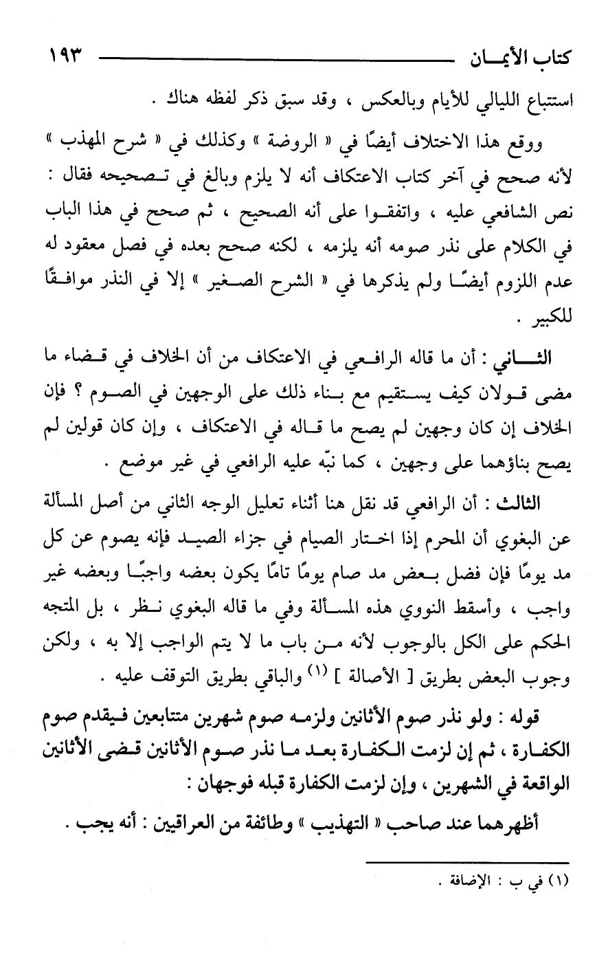 الثالث: أن الرافعي قد نقل هنا أثناء تعليل الوجه الثاني من أصل المسألة عن البغوي أن المحرم إذا اختار الصيام في جزاء الصيد فإنه يصوم عن كل مد يومًا فإن فضل بعض مد صام يومًا تامًا يكون بعضه واجبًا وبعضه غير واجب، وأسقط النووي هذه المسألة وفي ما قاله البغوي نظر، بل المتجه الحكم على الكل بالوجوب لأنه من باب ما لا يتم الواجب إلا به، ولكن وجوب البعض بطريق [الأصالة] (¬1) والباقي بطريق التوقف عليه.