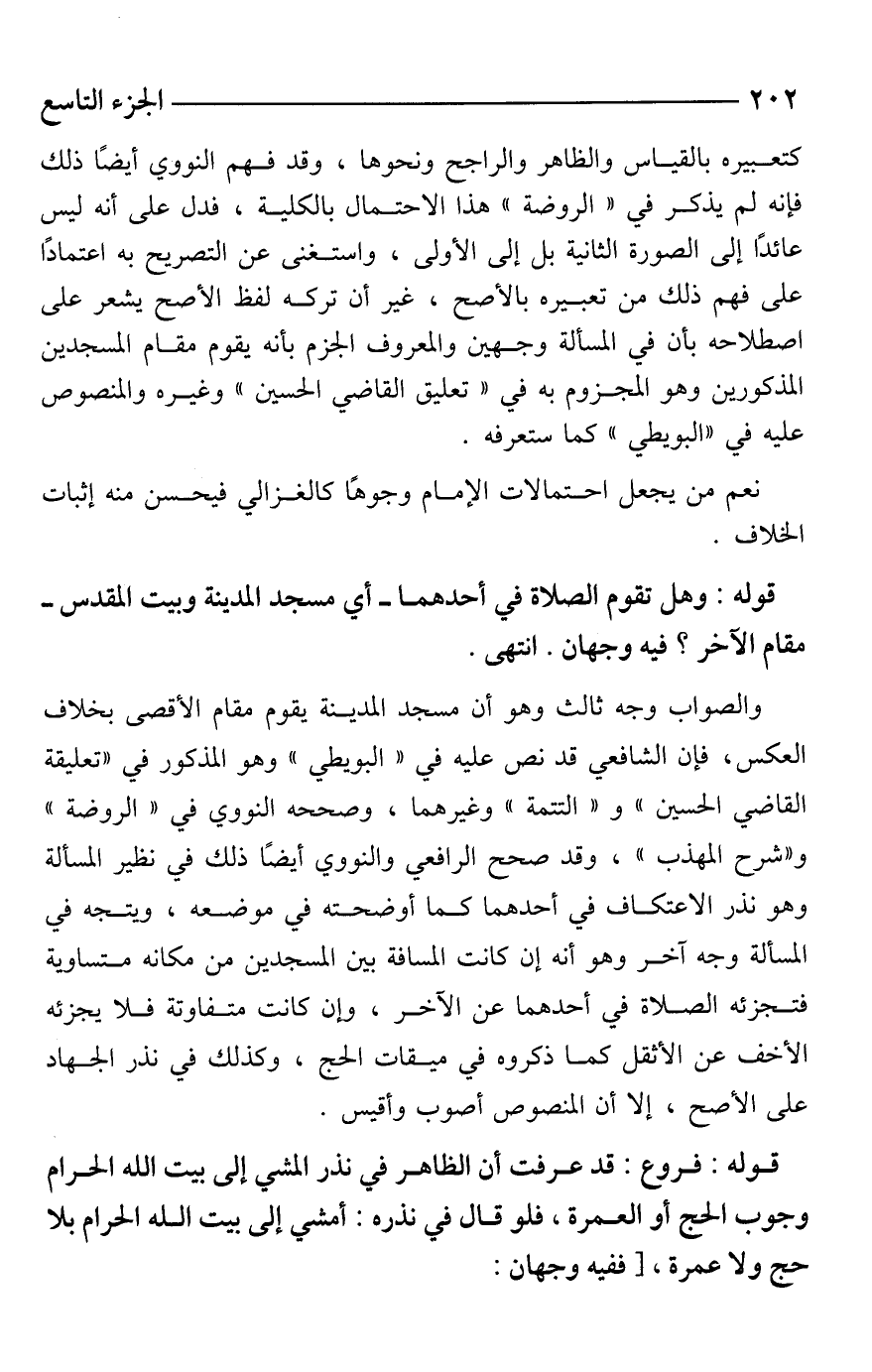 كتعبيره بالقياس والظاهر والراجح ونحوها، وقد فهم النووي أيضًا ذلك فإنه لم يذكر في "الروضة" هذا الاحتمال بالكلية، فدل على أنه ليس عائدًا إلى الصورة الثانية بل إلى الأولى، واستغنى عن التصريح به اعتمادًا على فهم ذلك من تعبيره بالأصح، غير أن تركه لفظ الأصح يشعر على اصطلاحه بأن في المسألة وجهين والمعروف الجزم بأنه يقوم مقام المسجدين المذكورين وهو المجزوم به في "تعليق القاضي الحسين" وغيره والمنصوص عليه في "البويطي" كما ستعرفه.