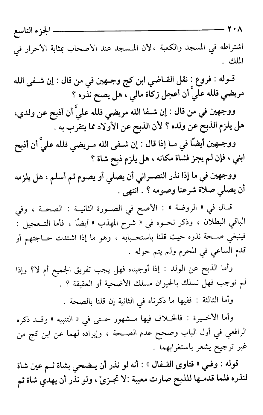ووجهين أيضًا في ما إذا قال: إن شفى الله مريضي فلله عليَّ أن أذبح ابني، فإن لم يجز فشاة مكانه، هل يلزم ذبح شاة؟