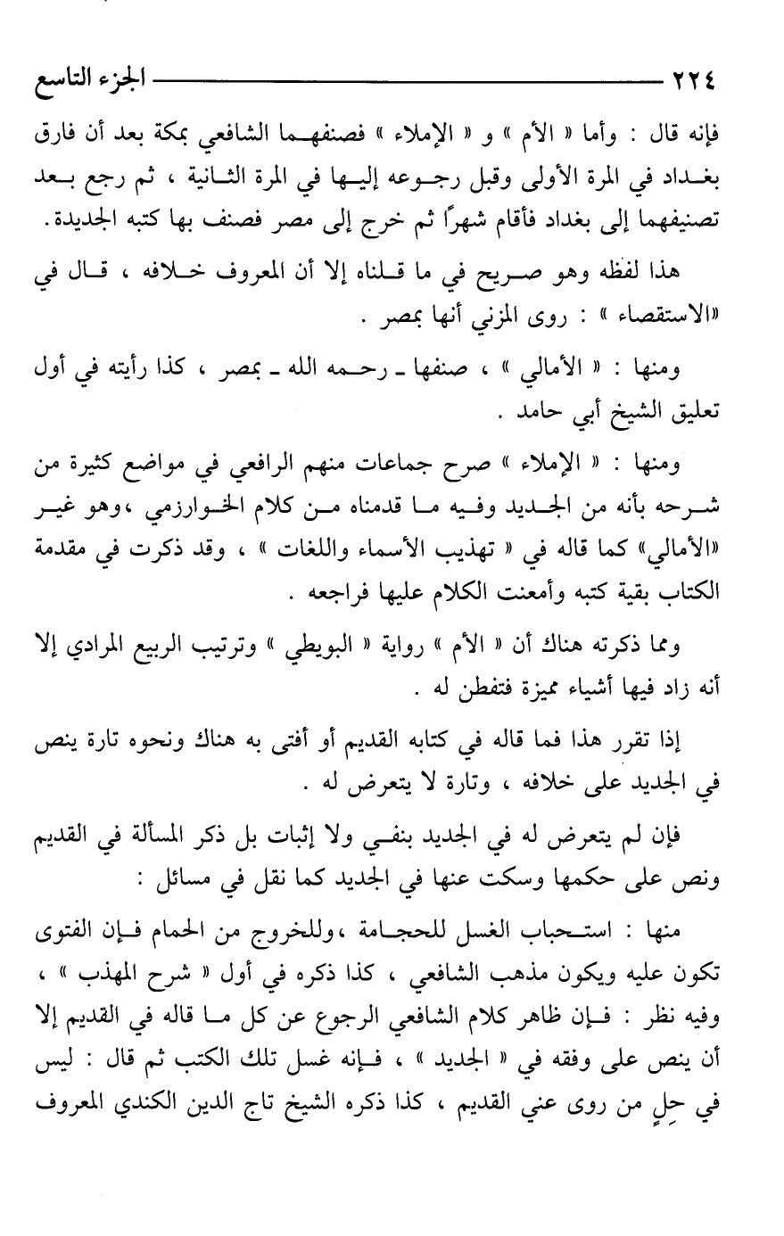 فإنه قال: وأما "الأم" و"الإملاء" فصنفهما الشافعي بمكة بعد أن فارق بغداد في المرة الأولى وقبل رجوعه إليها في المرة الثانية، ثم رجع بعد تصنيفهما إلى بغداد فأقام شهرًا ثم خرج إلى مصر فصنف بها كتبه الجديدة.