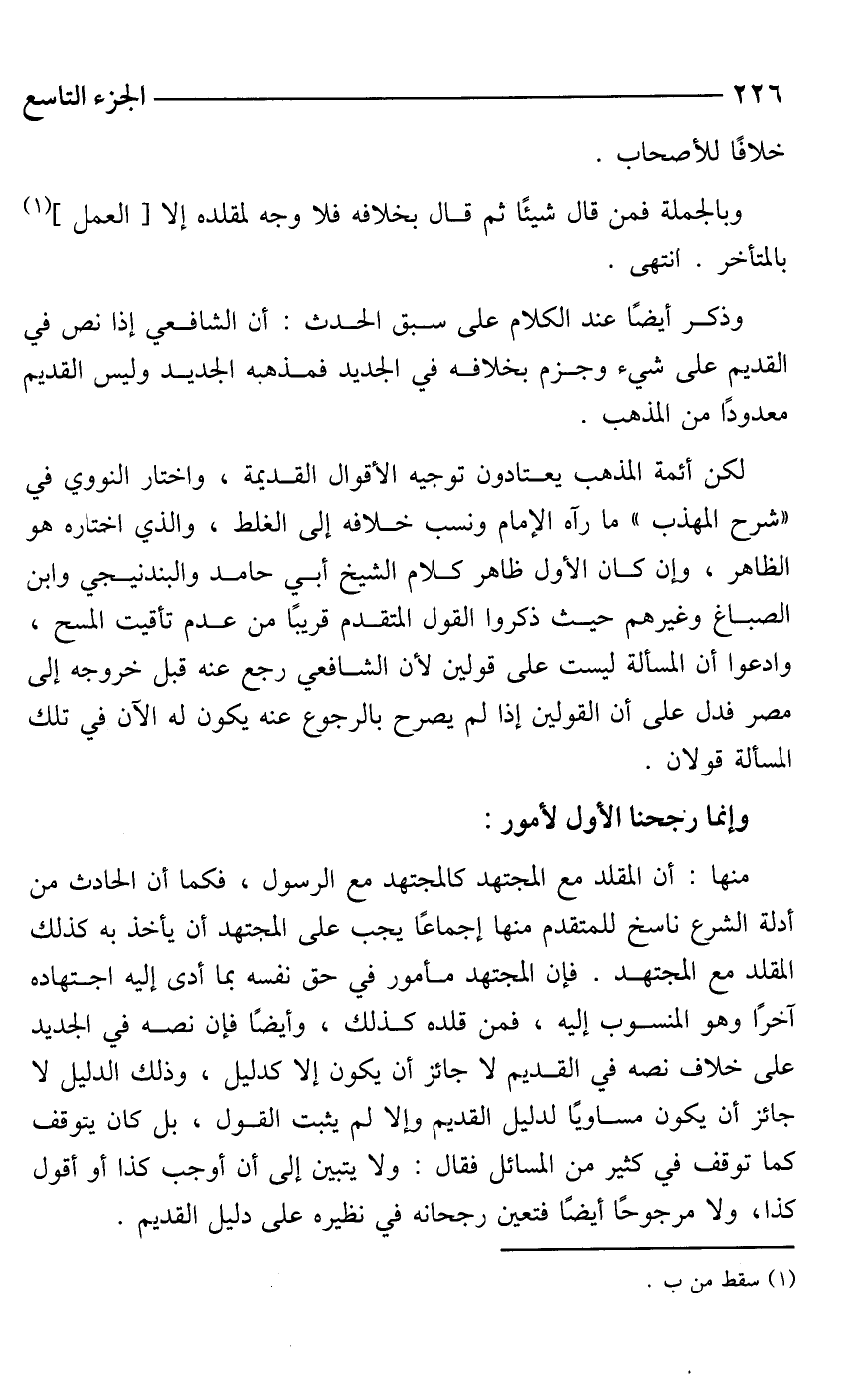 منها: أن المقلد مع المجتهد كالمجتهد مع الرسول، فكما أن الحادث من أدلة الشرع ناسخ للمتقدم منها إجماعًا يجب على المجتهد أن يأخذ به كذلك المقلد مع المجتهد. فإن المجتهد مأمور في حق نفسه بما أدى إليه اجتهاده آخرًا وهو المنسوب إليه، فمن قلده كذلك، وأيضًا فإن نصه في الجديد على خلاف نصه في القديم لا جائز أن يكون إلا كدليل، وذلك الدليل لا جائز أن يكون مساويًا لدليل القديم وإلا لم يثبت القول، بل كان يتوقف كما توقف في كثير من المسائل فقال: ولا يتبين إلى أن أوجب كذا أو أقول كذا، ولا مرجوحًا أيضًا فتعين رجحانه في نظيره على دليل القديم.
