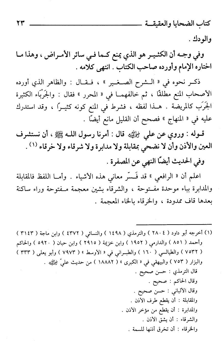 قوله: وروي عن علي - رضي الله عنه - قال: أمرنا رسول الله - صَلَّى اللَّهُ عَلَيْهِ وَسَلَّمَ -، أن نستشرف العين والأذن وأن لا نضحي بمقابلة ولا مدابرة ولا شرقاء ولا خرقاء (¬1).