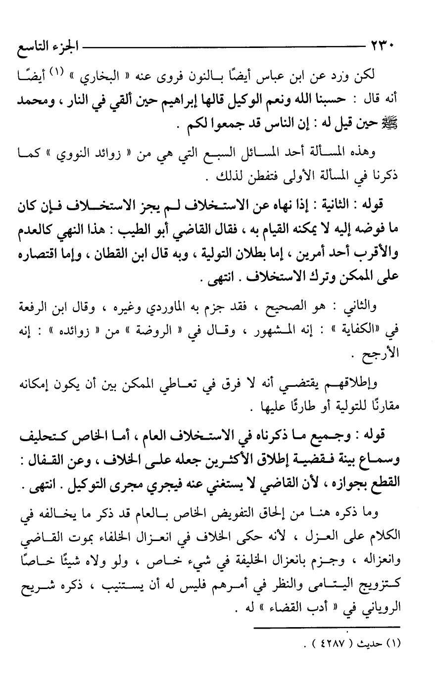 قوله: الثانية: إذا نهاه عن الاستخلاف لم يجز الاستخلاف فإن كان ما فوضه إليه لا يمكنه القيام به، فقال القاضي أبو الطيب: هذا النهي كالعدم والأقرب أحد أمرين، إما بطلان التولية، وبه قال ابن القطان، وإما اقتصاره على الممكن وترك الاستخلاف. انتهى.