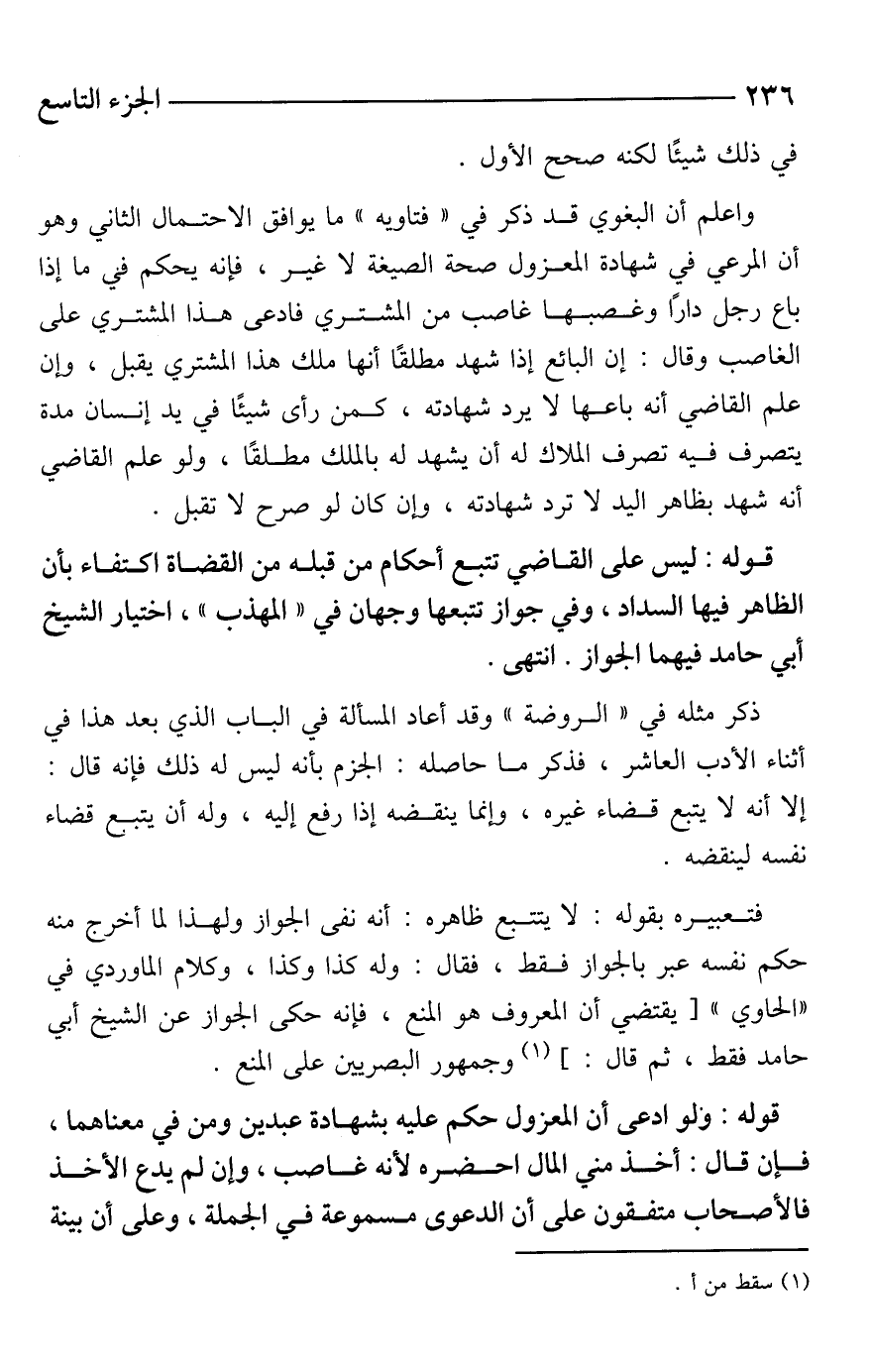 واعلم أن البغوي قد ذكر في "فتاويه" ما يوافق الاحتمال الثاني وهو أن المرعي في شهادة المعزول صحة الصيغة لا غير، فإنه يحكم في ما إذا باع رجل دارًا وغصبها غاصب من المشتري فادعى هذا المشتري على الغاصب وقال: إن البائع إذا شهد مطلقًا أنها ملك هذا المشتري يقبل، وإن علم القاضي أنه باعها لا يرد شهادته، كمن رأى شيئًا في يد إنسان مدة يتصرف فيه تصرف الملاك له أن يشهد له بالملك مطلقًا، ولو علم القاضي أنه شهد بظاهر اليد لا ترد شهادته، وإن كان لو صرح لا تقبل.