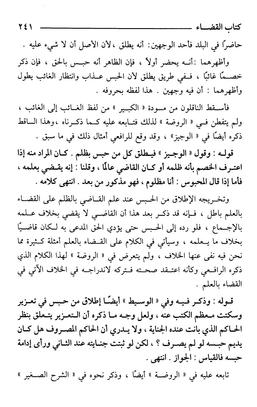 وتخريجه الإطلاق من الحبس عند علم القاضي بالظلم على القضاء بالعلم باطل، فإنه قد ذكر بعد هذا أن القاضي لا يقضي بخلاف علمه بالإجماع، فلو رده إلى الحبس حتى يؤدي الحق المدعى به لكان قاضيًا بخلاف ما يعلمه، وسيأتي في الكلام على القضاء بالعلم أمثلة كثيرة مما نحن فيه نفى عنها الخلاف، ولم يتعرض في "الروضة" لهذا الكلام الذي ذكره الرافعي وكأنه اعتقد صحته فتركه لاندراجه في الخلاف الآتي في القضاء بالعلم.
