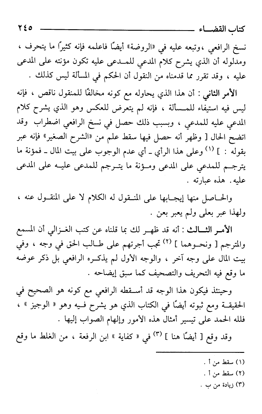 الأمر الثاني: أن هذا الذي يحاوله مع كونه مخالفًا للمنقول ناقص، فإنه ليس فيه استيفاء للمسألة، فإنه لم يتعرض للعكس وهو الذي يشرح كلام المدعي عليه للمدعي، وبسبب ذلك حصل في نسخ الرافعي اضطراب وقد اتضح الحال [وظهر أنه حصل فيها سقط علم من "الشرح الصغير" فإنه عبر بقوله: ] (¬1) وعلى هذا الرأي -أي عدم الوجوب على بيت المال- فمؤنة ما يترجم للمدعي على المدعى ومؤنة ما يترجم للمدعى عليه على المدعى عليه. هذه عبارته.