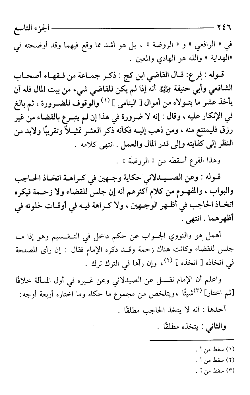 قوله: وعن الصيدلاني حكاية وجهين في كراهة اتخاذ الحاجب والبواب، والمفهوم من كلام أكثرهم أنه إن جلس للقضاء ولا زحمة فيكره اتخاذ الحاجب في أظهر الوجهين، ولا كراهة فيه في أوقات خلوته في أظهرهما. انتهى.