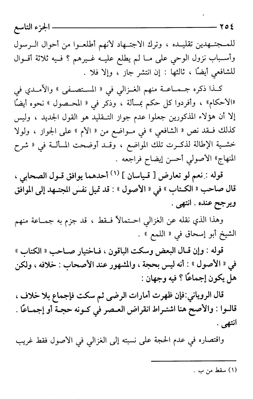 كذا ذكره جماعة منهم الغزالي في "المستصفى" والآمدي في "الأحكام"، وأفردوا كل حكم بمسألة، وذكر في "المحصول" نحوه أيضًا إلا أن هؤلاء المذكورين جعلوا عدم جواز التقليد هو القول الجديد، وليس كذلك فقد نص "الشافعي" في مواضع من "الأم" على الجواز، ولولا خشية الإطالة لذكرت تلك المواضع، وقد أوضحت المسألة في "شرح المنهاج" الأصولي أحسن إيضاح فراجعه.