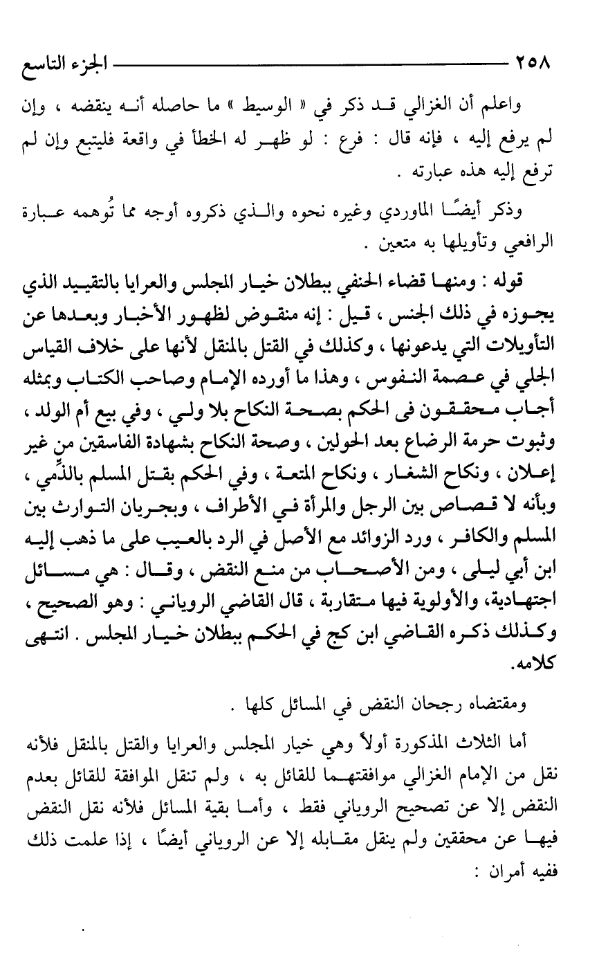 أما الثلاث المذكورة أولًا وهي خيار المجلس والعرايا والقتل بالمنقل فلأنه نقل من الإمام الغزالي موافقتهما للقائل به، ولم تنقل الموافقة للقائل بعدم النقض إلا عن تصحيح الروياني فقط، وأما بقية المسائل فلأنه نقل النقض فيها عن محققين ولم ينقل مقابله إلا عن الروياني أيضًا، إذا علمت ذلك ففيه أمران: