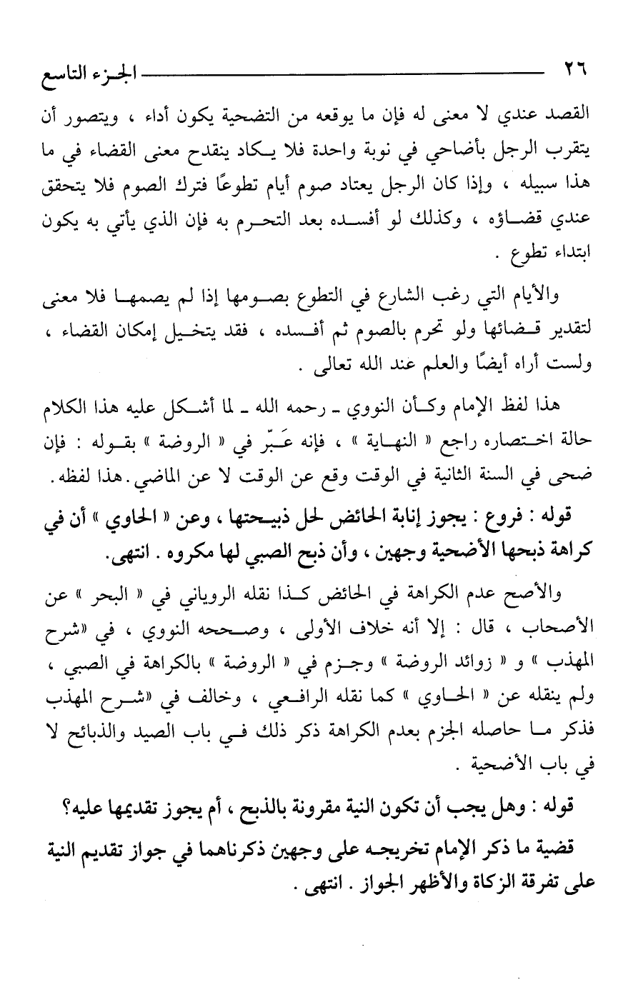 هذا لفظ الإمام وكأن النووي -رحمه الله- لما أشكل عليه هذا الكلام حالة اختصاره راجع "النهاية"، فإنه عَبّر في "الروضة" بقوله: فإن ضحى في السنة الثانية في الوقت وقع عن الوقت لا عن الماضي. هذا لفظه.