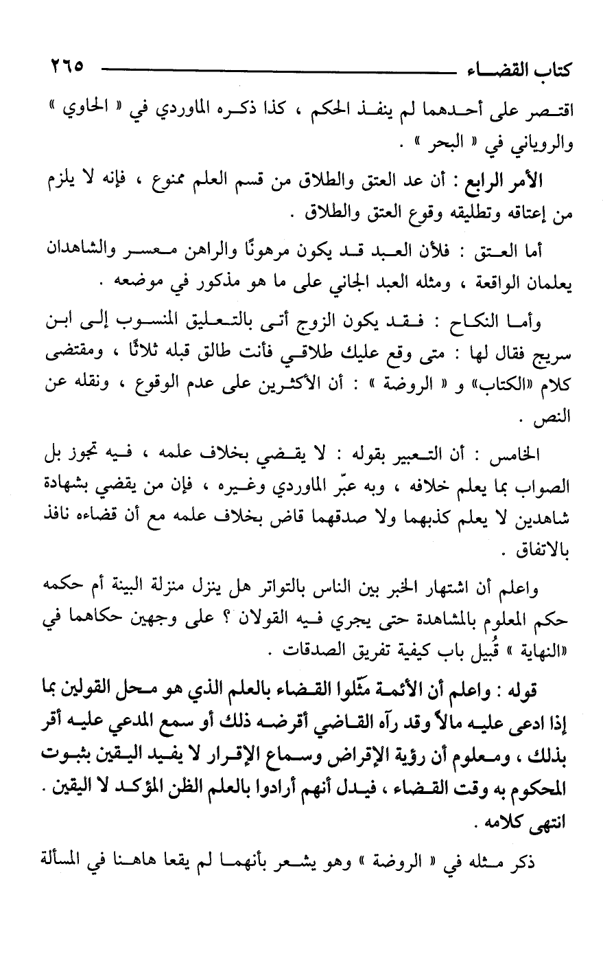 الخامس: أن التعبير بقوله: لا يقضي بخلاف علمه، فيه تجوز بل الصواب بما يعلم خلافه، وبه عبّر الماوردي وغيره، فإن من يقضي بشهادة شاهدين لا يعلم كذبهما ولا صدقهما قاض بخلاف علمه مع أن قضاءه نافذ بالاتفاق.