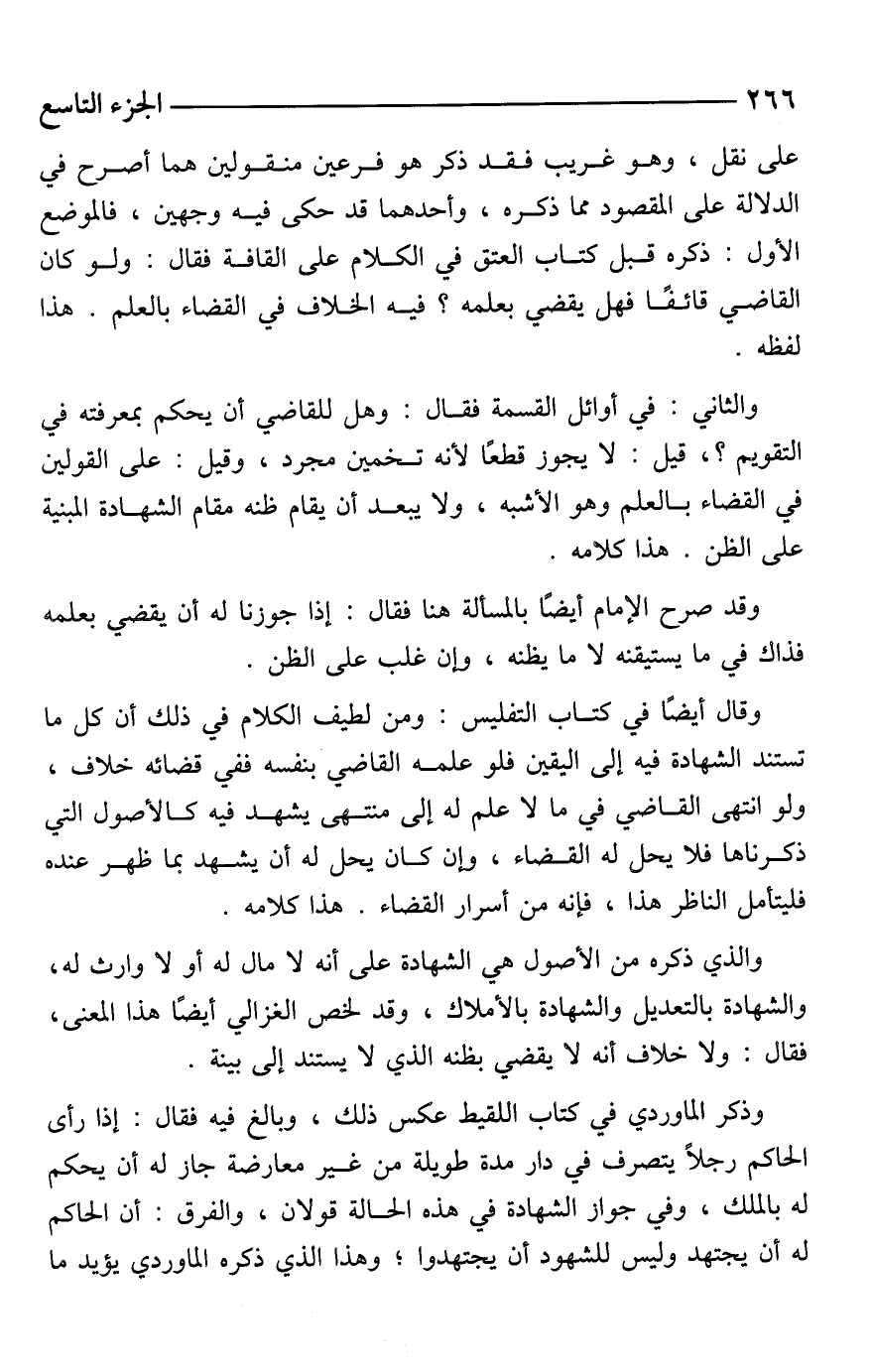 وقال أيضًا في كتاب التفليس: ومن لطيف الكلام في ذلك أن كل ما تستند الشهادة فيه إلى اليقين فلو علمه القاضي بنفسه ففي قضائه خلاف، ولو انتهى القاضي في ما لا علم له إلى منتهى يشهد فيه كالأصول التي ذكرناها فلا يحل له القضاء، وإن كان يحل له أن يشهد بما ظهر عنده فليتأمل الناظر هذا، فإنه من أسرار القضاء. هذا كلامه.