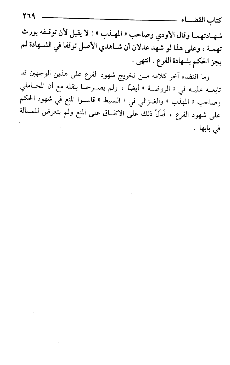 وما اقتضاه آخر كلامه من تخريج شهود الفرع على هذين الوجهين قد تابعه عليه في "الروضة" أيضًا، ولم يصرحا بنقله مع أن المحاملي وصاحب "المهذب" والغزالي في "البسيط" قاسوا المنع في شهود الحكم على شهود الفرع، فَدَلّ ذلك على الاتفاق على المنع ولم يتعرض للمسألة في بابها.