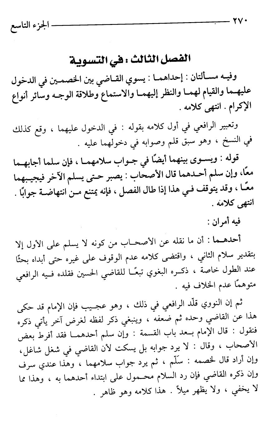 ثم إن النووي قلّد الرافعي في ذلك، وهو عجيب فإن الإمام قد حكى هذا عن القاضي وحده ثم ضعفه، وينبغي ذكر لفظه لغرض آخر يأتي ذكره فنقول: قال الإمام بعد باب القسمة: وإن سلم أحدهما فقد أفرط بعض الأصحاب، وقال: لا يرد جوابه بل يسكت لأن القاضي في شغل شاغل، وإن أراد قال لخصمه: سَلّم، ثم يرد جواب سلامهما، وهذا عندي سرف وإن ذكره القاضي فإن رد السلام محمول على ابتداء أحدهما به، وهذا مما لا يخفي، ولا يظهر ميلًا. هذا كلامه وهو ظاهر.
